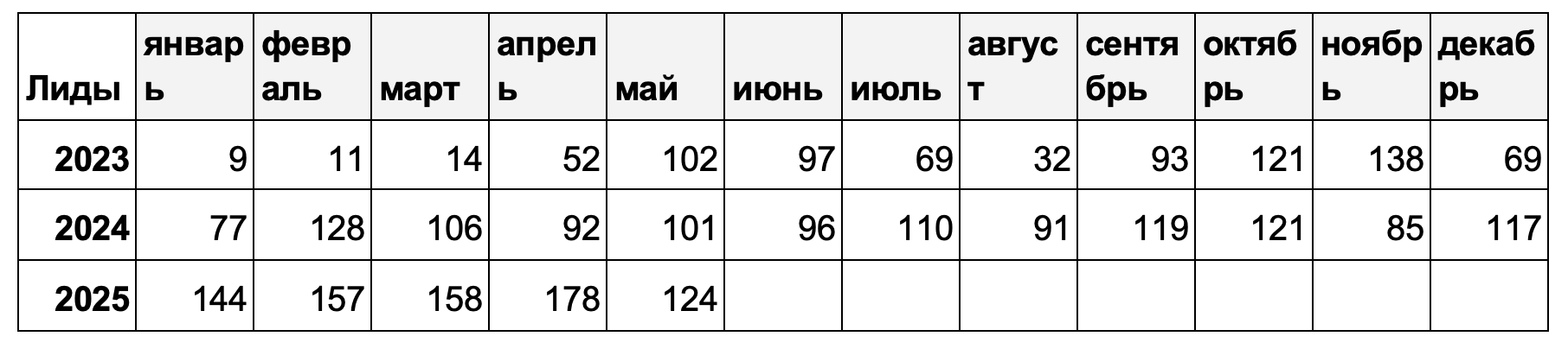 рост общего количества лидов на 45% по сравнению с 2023 годом;