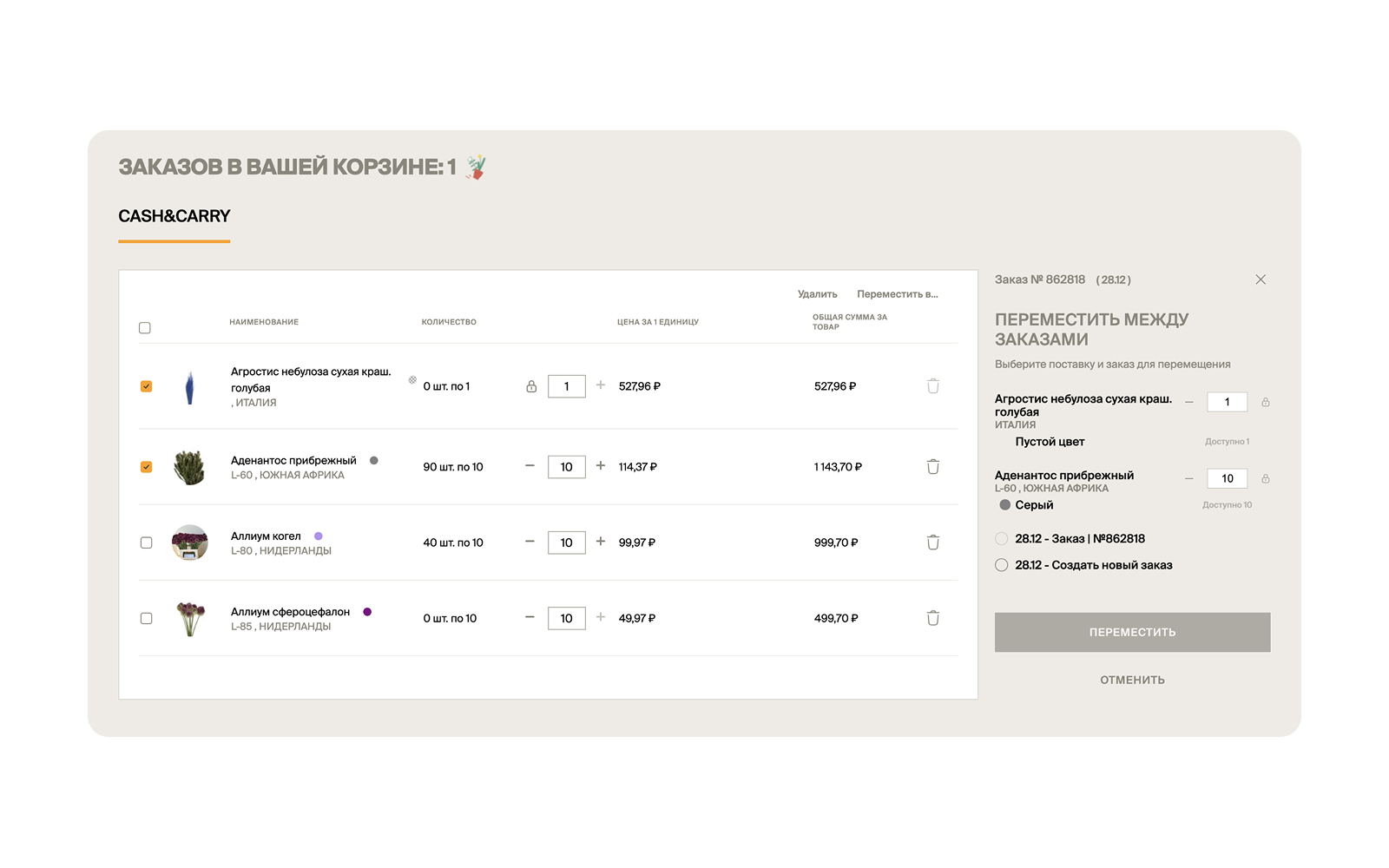 И новый дизайн работы с заказами в корзине. Товар стало видно лучше, добавились фильтры, переносить товар между заказами стало проще.