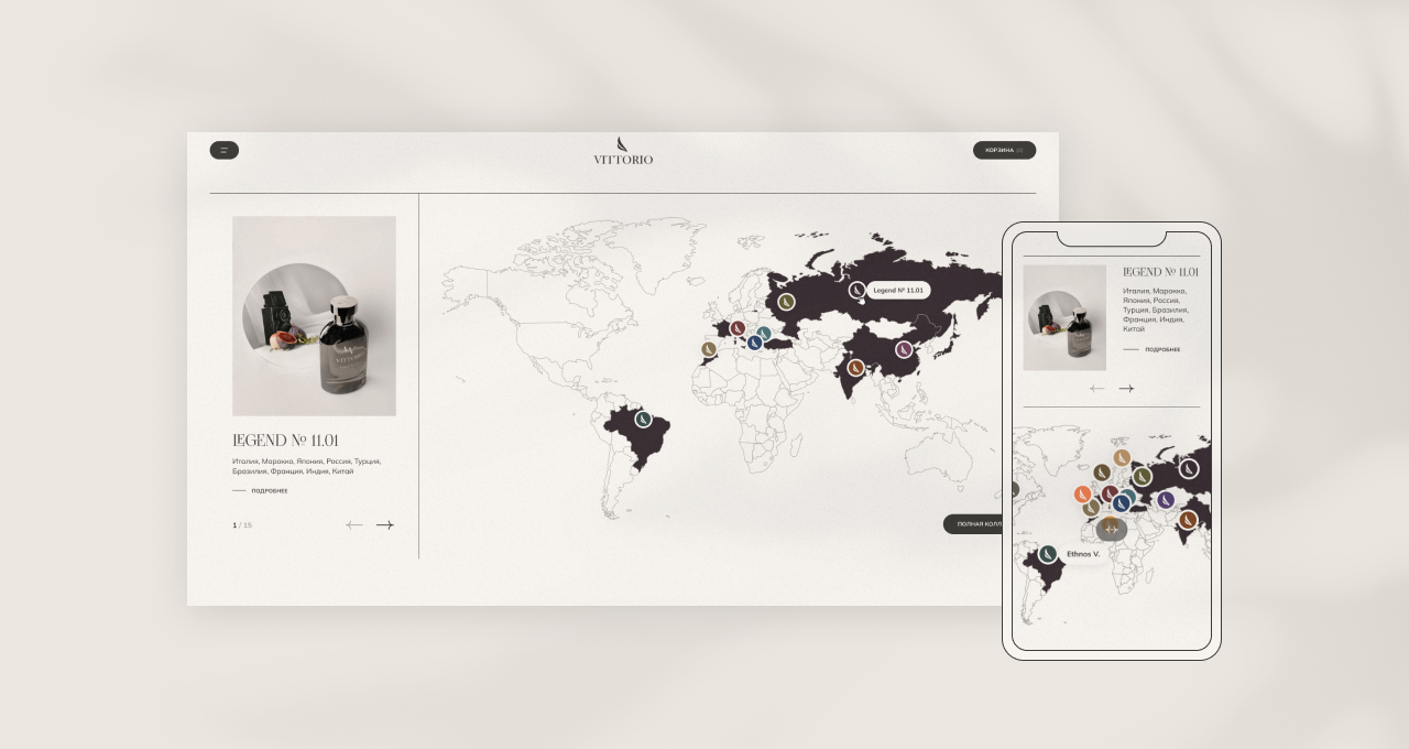 Мы сделали не просто интерактивную карту, мы превратили коллекцию Витторио в настоящее путешествие. На карте ароматов пользователь видит, где парфюмер черпает вдохновение и ингредиенты для каждого букета. Французская лаванда, индийский сандал, сицилийский бергамот — эта точка на карте раскрывает историю запаха, переносит в атмосферу страны и позволяет передать ее характер через экран.
