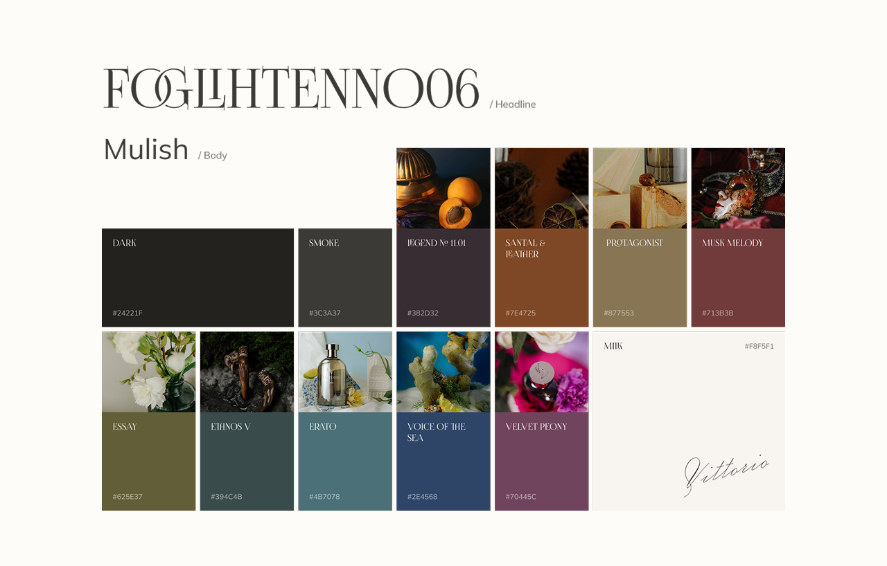 Для Витторио мы предложили приглушенную цветовую гамму, основанную на ожиданиях благородных результатов. Мягкие градиенты создают плавные переходы между блоками и перекликаются с настроением ароматов. Каждый воспринимается как отдельный экран истории, но при этом сохраняет визуальное единство бренда. Важно было изменить границу Витторио и при этом избежать резервной «официальности» — палитра работает на эмоции, а не на холодную строгость.