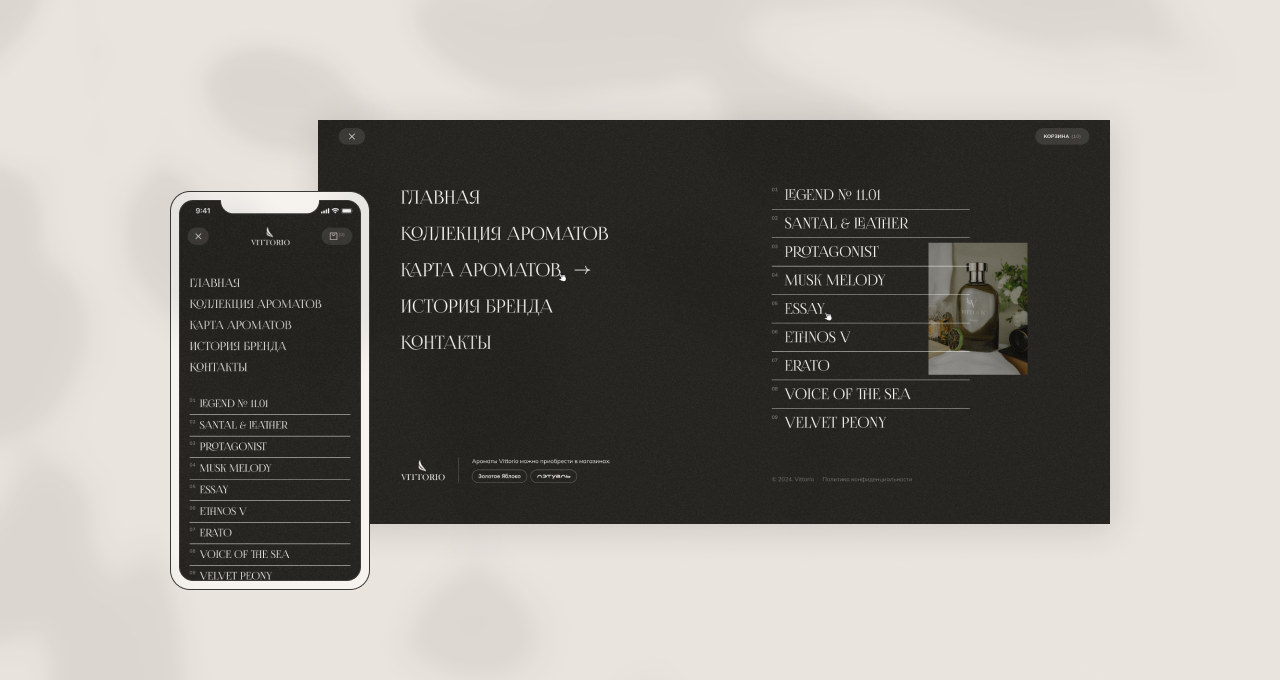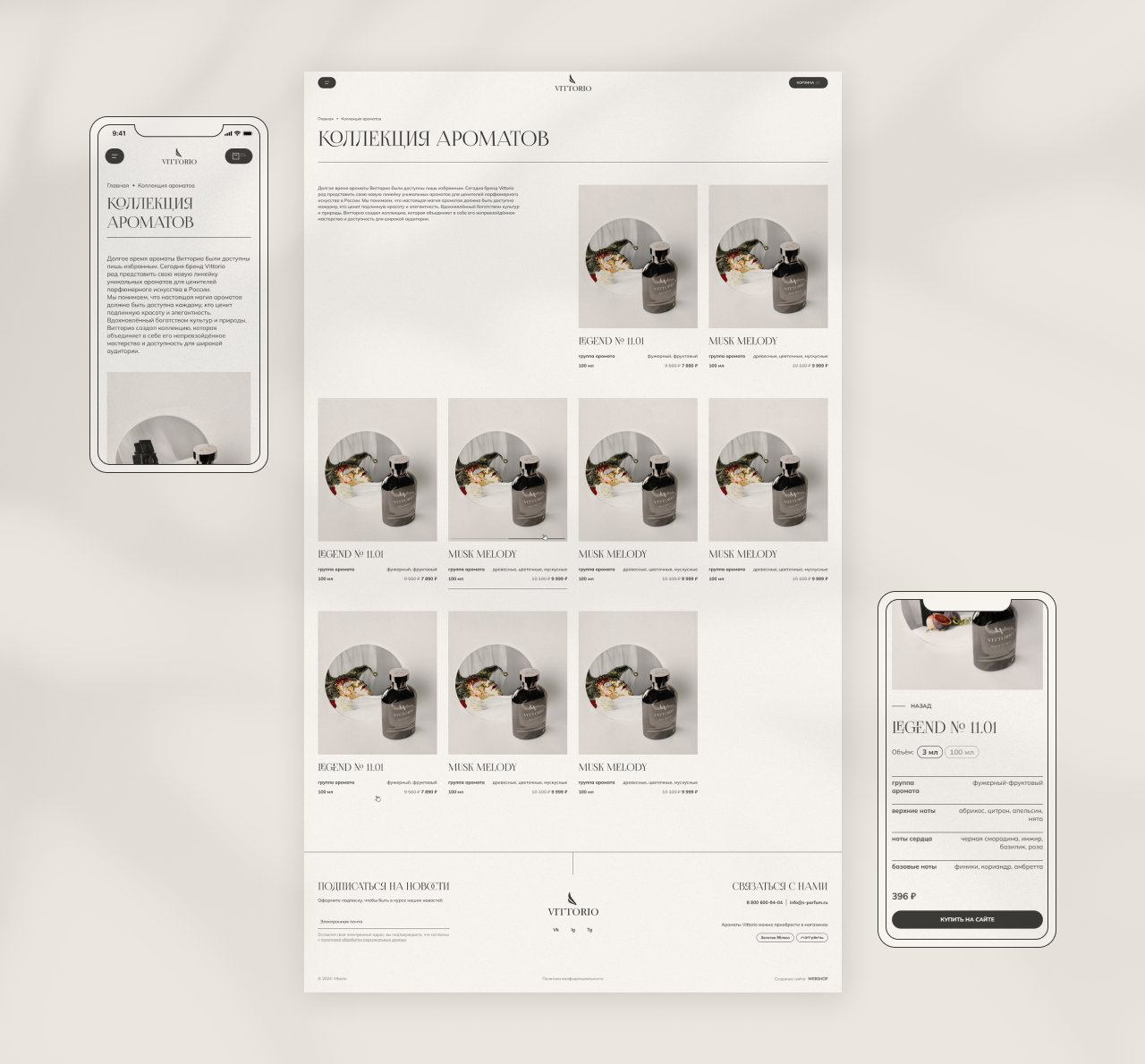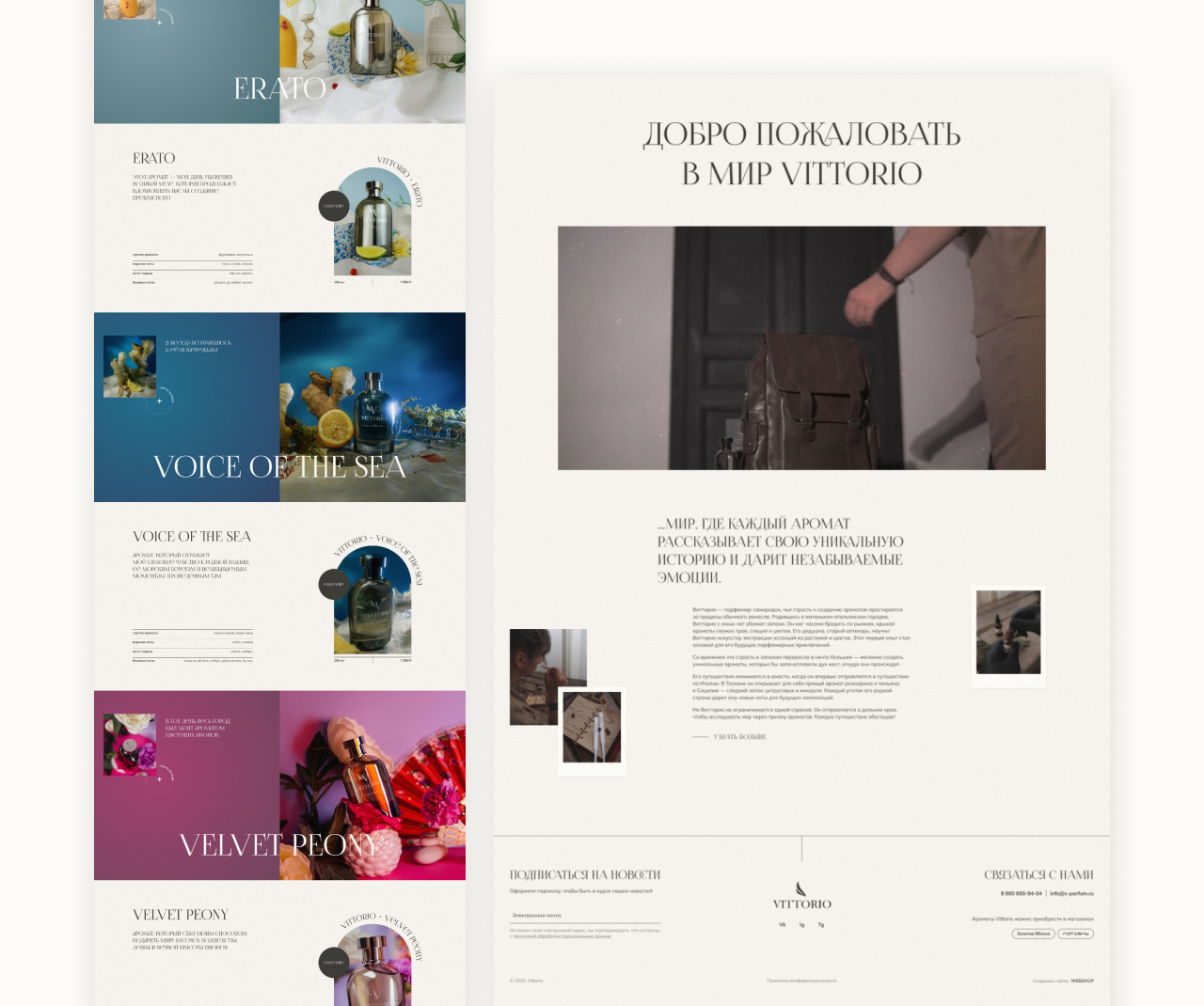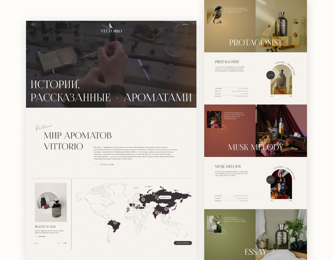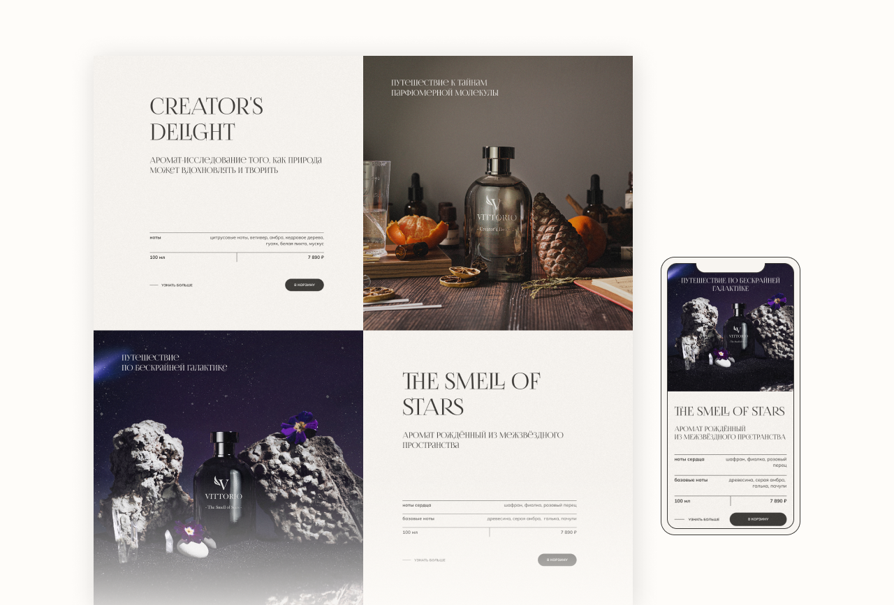 Главная страница сайта Витторио стала не витриной, настоящим путешествием по миру ароматов. Мы подошли к задаче так, как будто создателем не интернет-магазина, а выставкой живого искусства. Каждый аромат подан как отдельная глава истории — со своей визуальной атмосферой, текстовым сопровождением и цветовой драматургией.