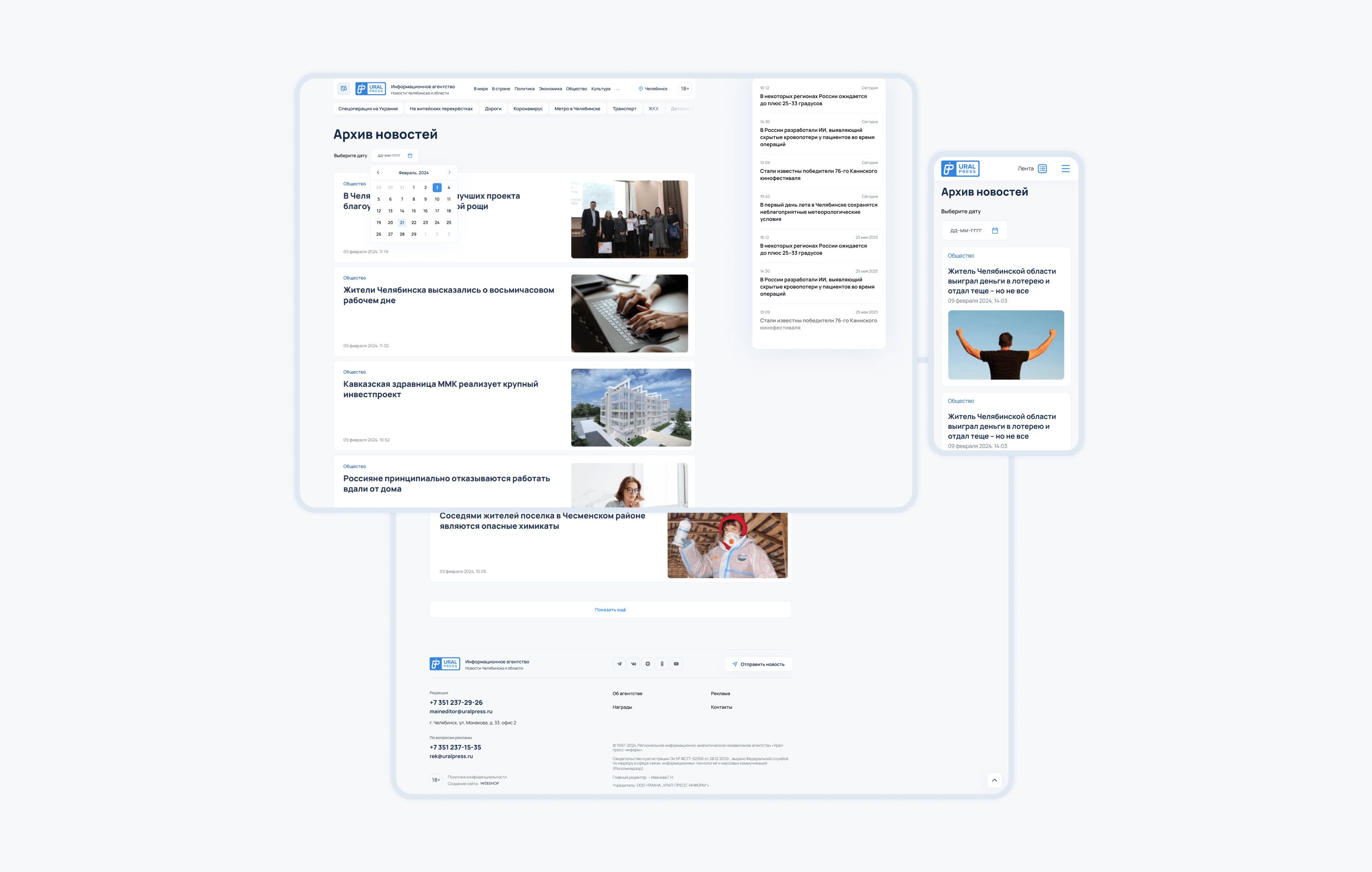 У URALPRESS большое количество новостей с 90х годов. Иногда хочется вернуться к архивам, найти новость от определенной даты, или просто посмотреть, какие новости были раньше и какие события освещались, как менялись тенденции. Для этого мы реализовали удобный поиск с дополнительной системой фильтрации по рубрикам и датам: