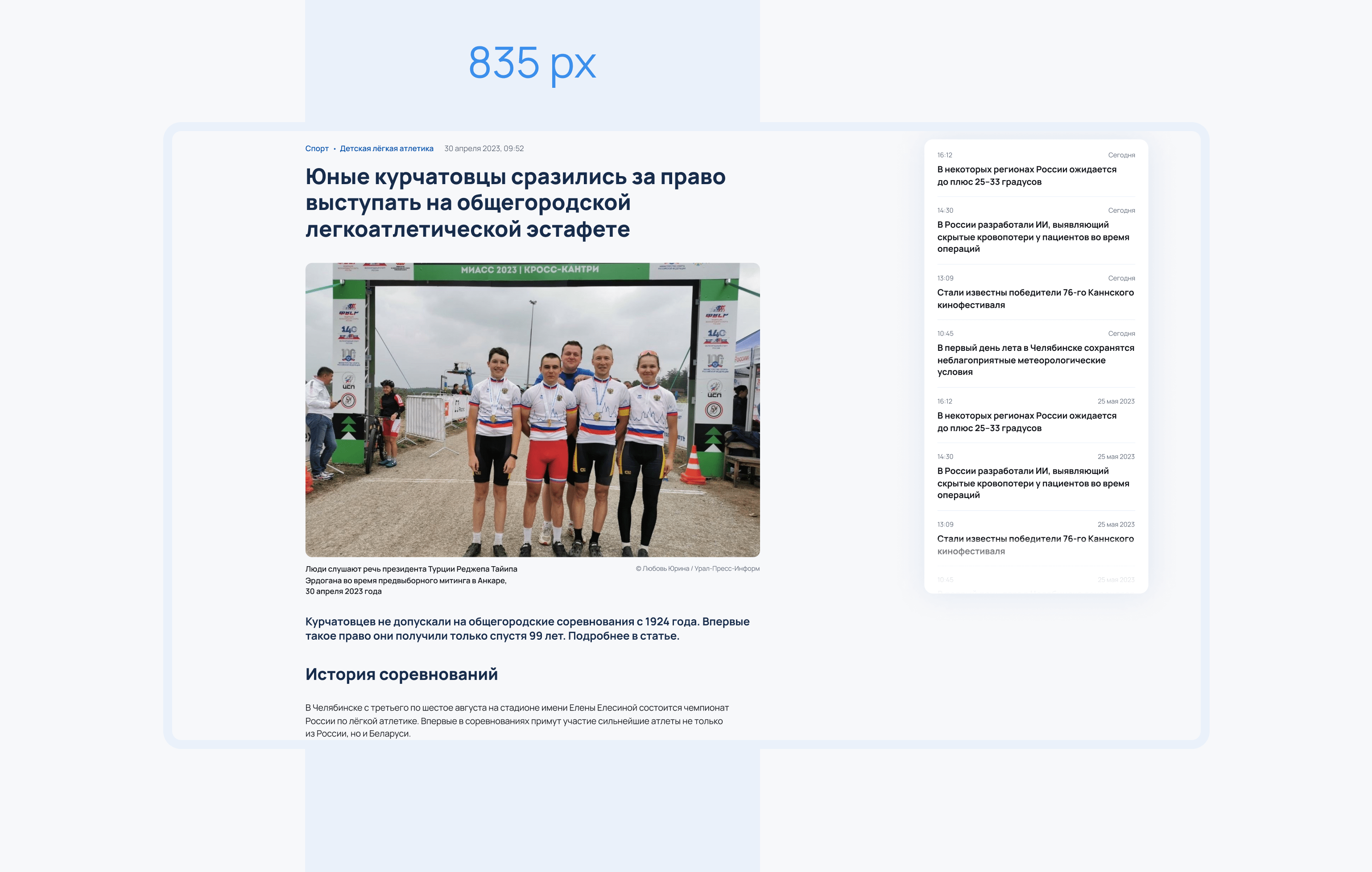 Выше мы уже говорили, что как только, читатель попадает на сайт, перед ним представлены все актуальные новости. Для комфортного чтения, мы задали сетку не более 835 px. Так, глаза не бегают от края до края экрана.