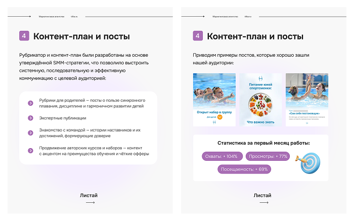 Привет! Мы — агентство «В точку». Когда старый SMM не работает, нужен полный перезапуск. Именно такую задачу мы решили для школы синхронного плавания. В этом кейсе — наш путь: от разработки фирменного стиля и контент-плана до запуска таргета, который принёс рост охватов на 104% и целевые заявки.