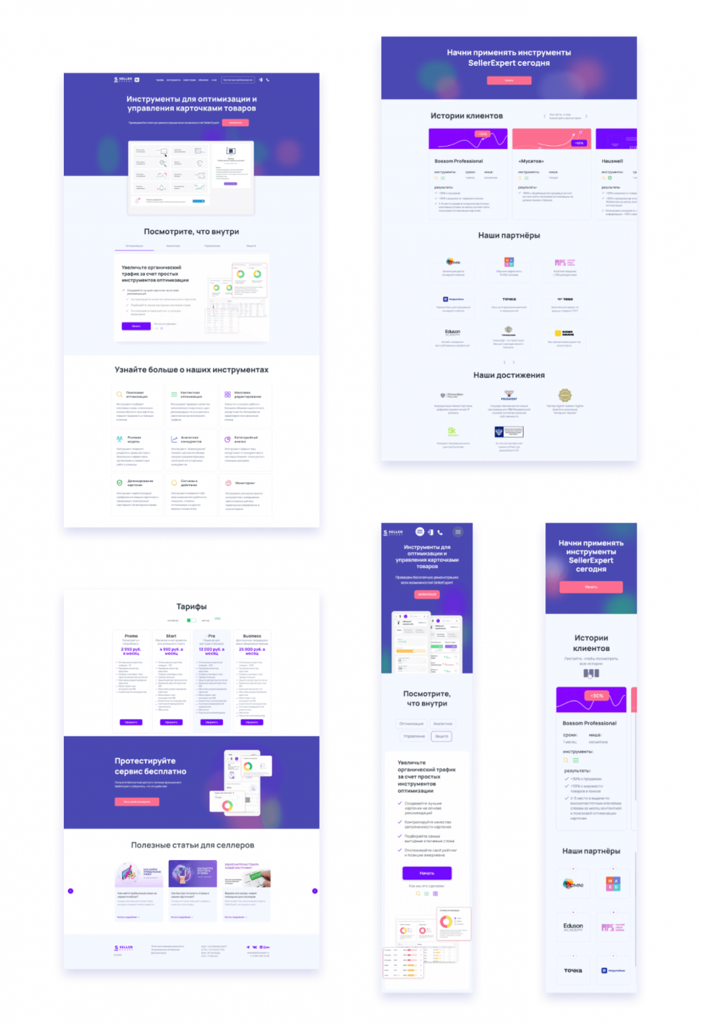 Перед тем, как приступить к разработке дизайн-концепции, мы предоставили заказчику мудборд с примерами сайтов, чтобы отразить его предпочтения и стилистическое видение проекта. В результате мы виноваты, что комиссия SellerExpert импонирует минимализм, градиент, плавную анимацию и эффект стекла.