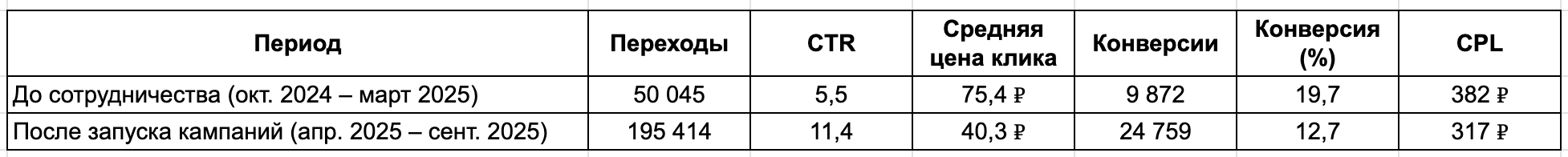 Мы внедрили регулярную отчётность: еженедельные звонки с клиентом, совместный анализ данных, согласование гипотез и быстрые корректировки кампаний.