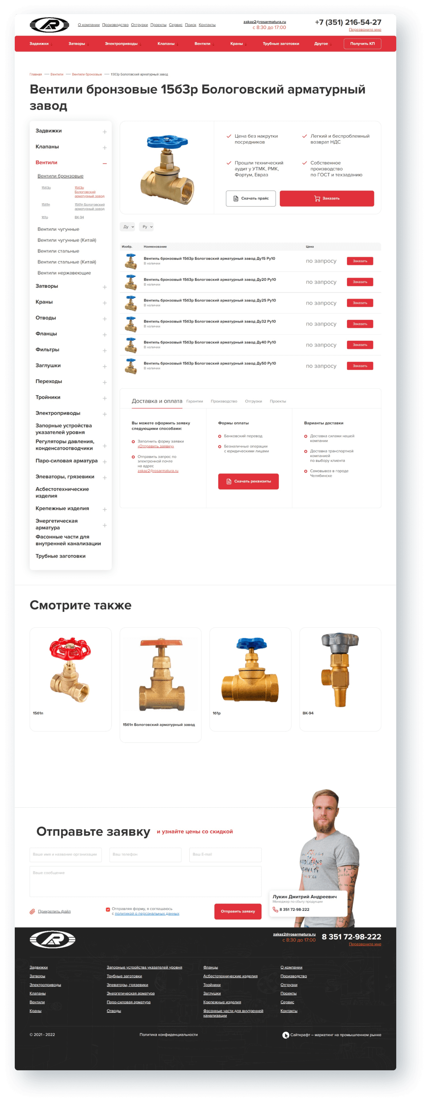 Блок «Смотрите также» — ссылки на оригинальные товары (задвижки других диаметров, материалов и образцов соединений). Это повысит конверсию и улучшит перелинковку для SEO .