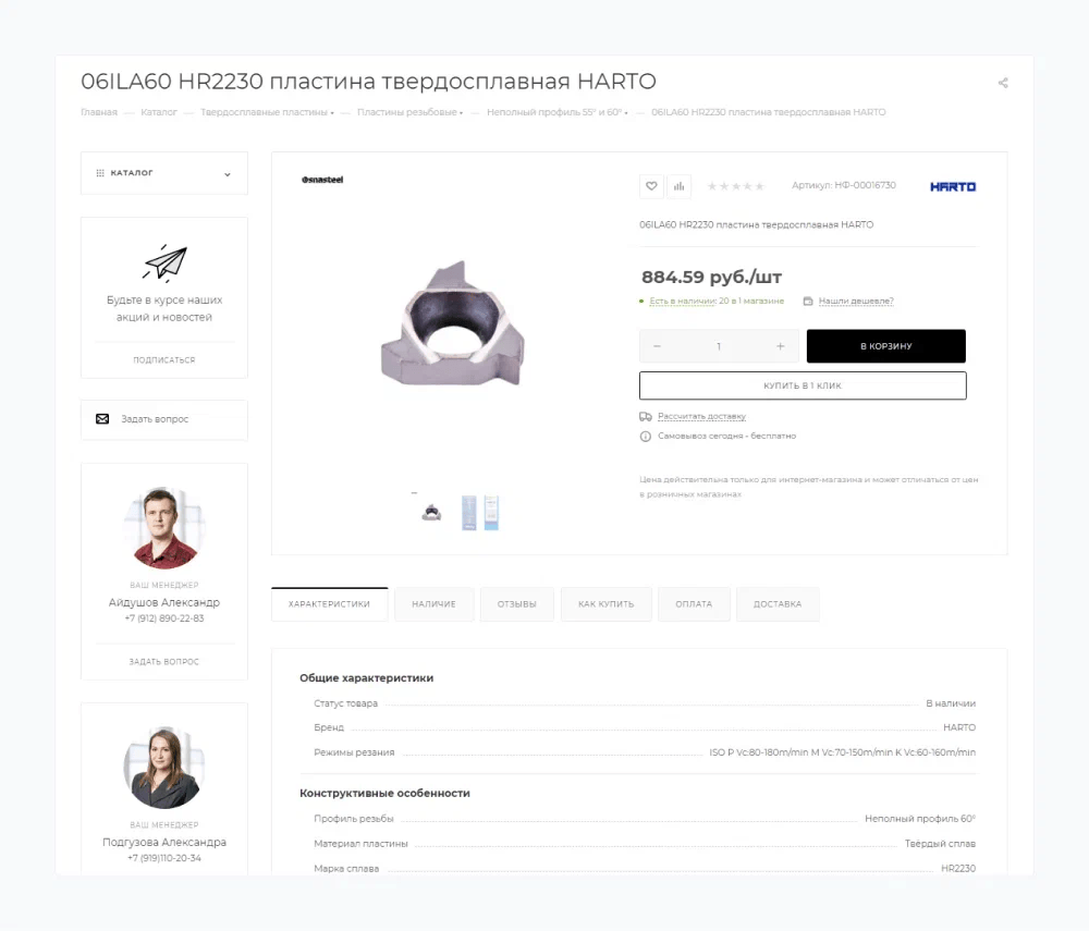 Чтобы инженеры и технологи быстро находили нужные товары, карточки товаров оформлены в табличном виде. Характеристики разделены на три блока: