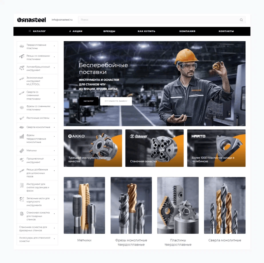 Дизайнеры разработали фирменное оформление в цветах Osnasteel. На баннерах — категории инструментов и визуальные акценты на направления бизнеса. Все в едином стиле, без перегрузки.