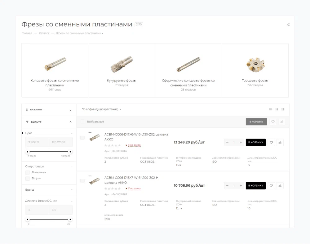 умный фильтр для подбора инструментов по материалу, размеру и цене.