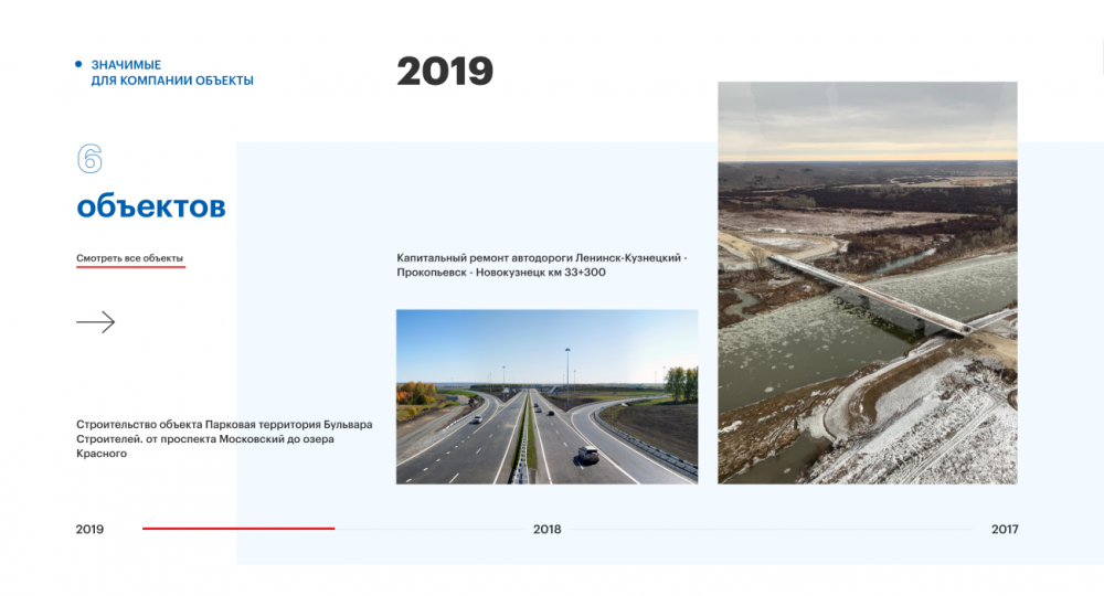 Чтобы передать специфику деятельности, мы разместили фотографии реализованных объектов. Благодаря им пользователь сразу понимает, что компания занимается строительством и благоустройством. Проекты на фото показывают масштаб компании — это улицы, пространства и дороги, которыми пользуются сотни тысяч кузбассовцев ежедневно.