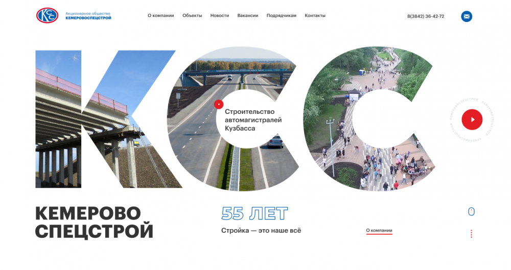 Основная задача страницы — рассказать о деятельности, успехах и преимуществах «Кемеровоспецстрой». Мы решили, что лучше всего это сделают кейсы — компания работает с крупными объектами городской инфраструктуры, поэтому такие примеры отражают и масштабы, и значимость компании для области.