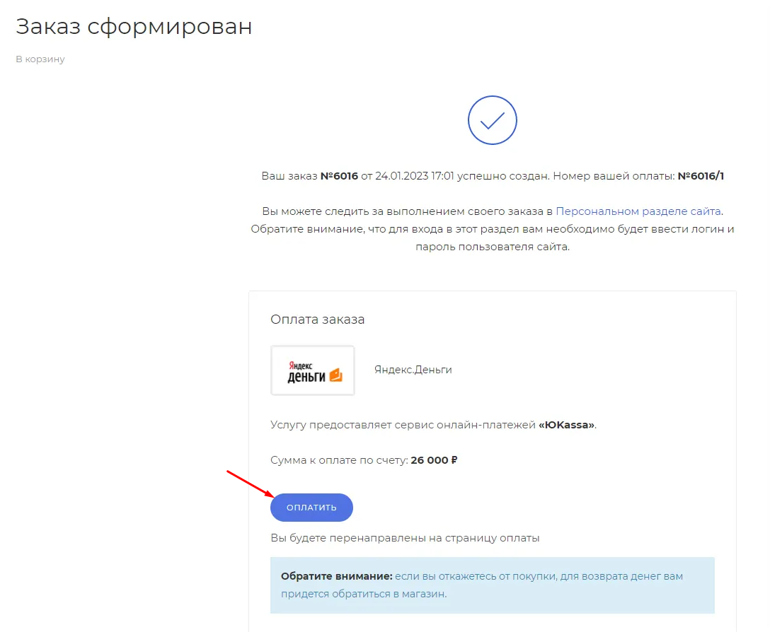 Стандартный функционал 1С-Битрикс дополнен дополнительным нажатием кнопки «Оплатить» после формирования заказа. Многие клиенты игнорируют этот шаг, который приводит к потере продаж.