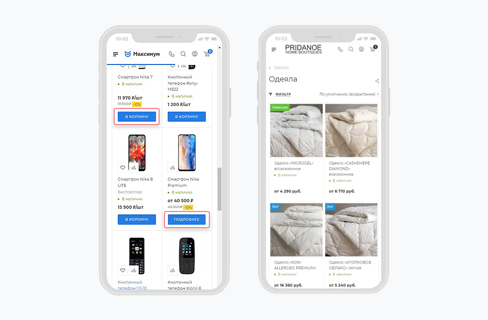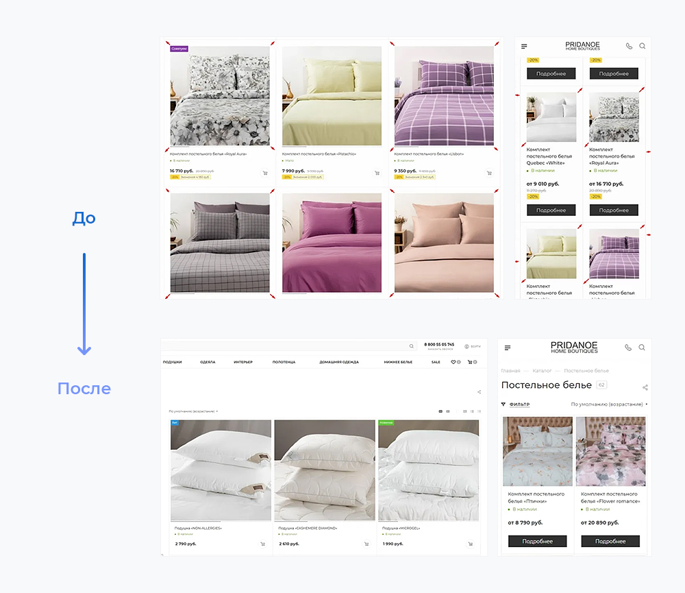 Анализ поведенческих факторов показал, что большинство покупок домашнего текстиля происходит на отдельных страницах товаров, где покупатели выбирают комплектацию и расцветку. Для получения этих данных специалисты убрали кнопку заказа мобильной версии каталога, освободив место для более крупных изображений.