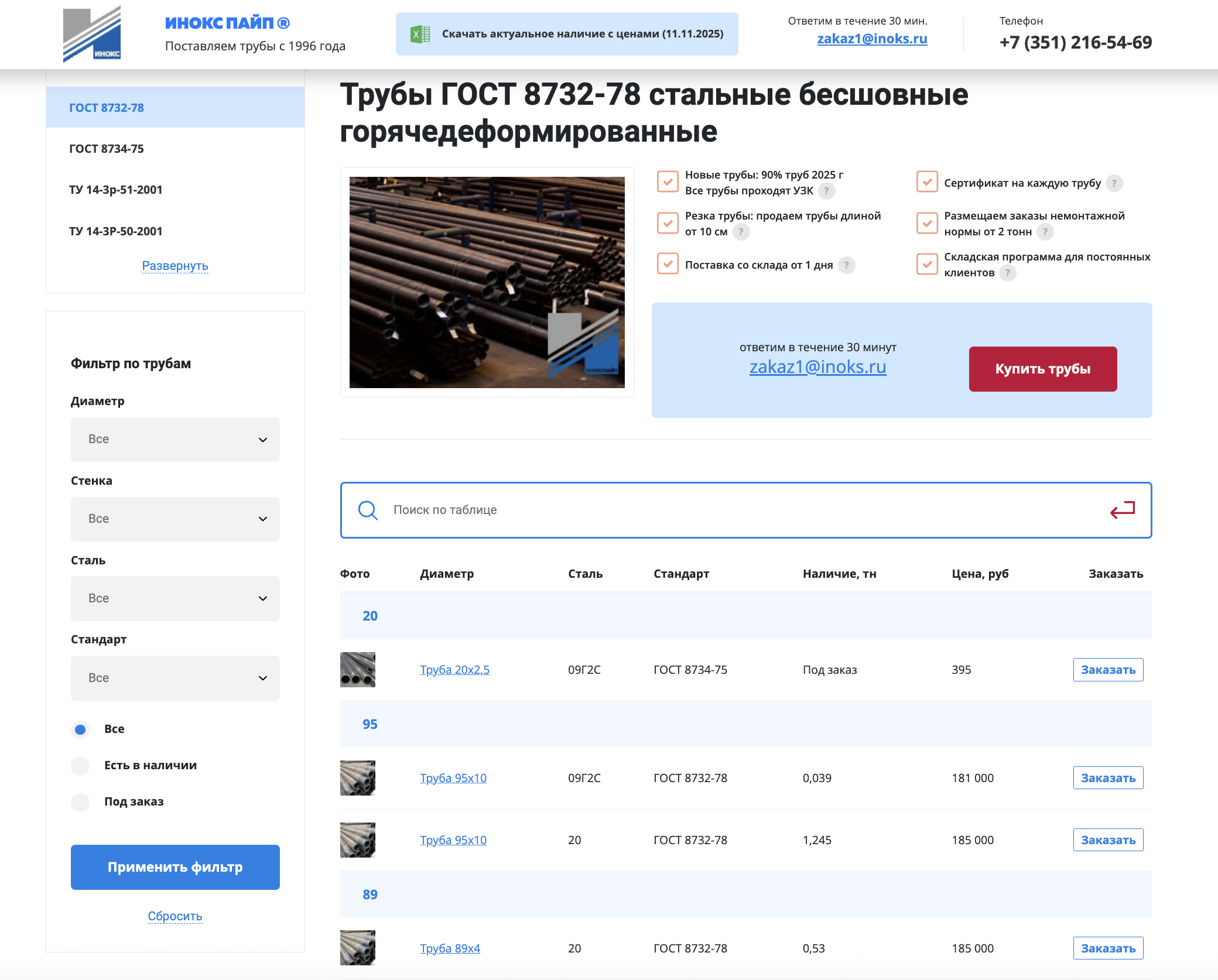 Внедрили фильтры по типу стали, по диаметру, по толщине стенки.