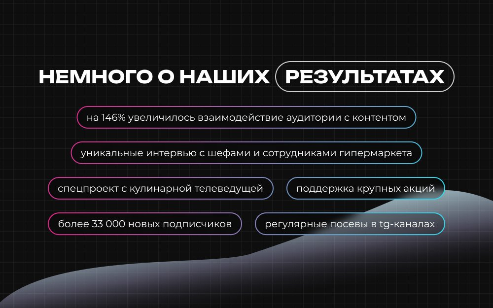 Рост площадок и содержание помещений . Помимо таргетированной рекламы мы дозированно использовали еще три инструмента: посевы в релевантных ТГ-каналах, бартерное сотрудничество с лидерами мнений (шефами) и розыгрыши. Последний работал на удержании подписчиков, на конкурсах можно было выиграть нужные всем профессионалам подарки: разделочные доски, фартуки, сковородки, мясорубки, наборы приправ. Также мы провели спецпроект с кулинарной телеведущей, в рамках которого сняли серию рецептов с бренд-шефом гипермаркета.