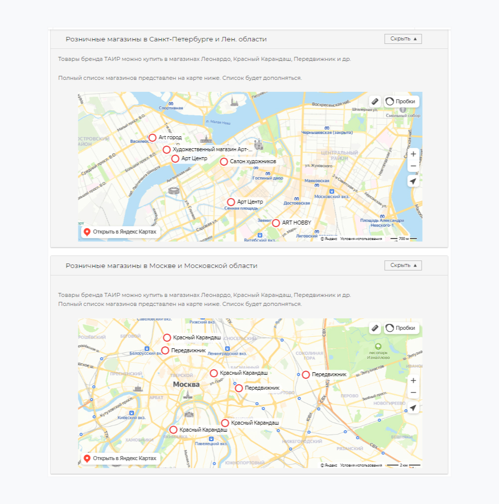 Раздел «Где купить» содержит интерактивную карту магазинов-партнеров в Москве, Санкт-Петербурге и других городах России. Для удобства пользователей также предусмотрен список адресов в текстовом формате.