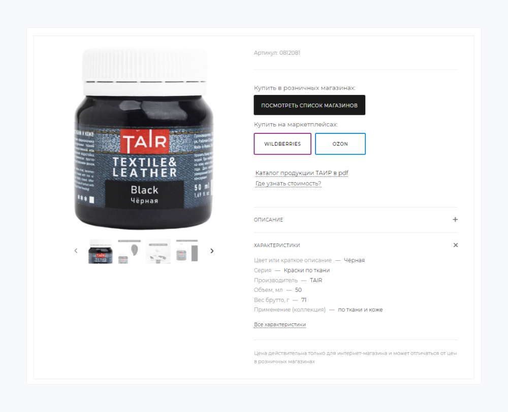 Карточки товаров адаптированы под изменившуюся стратегию продаж. Неавторизованные пользователи вместо кнопок покупки видят три варианта действий: переходы на страницы товара в Wildberries и Ozon, а также в раздел поиска офлайн-партнеров.