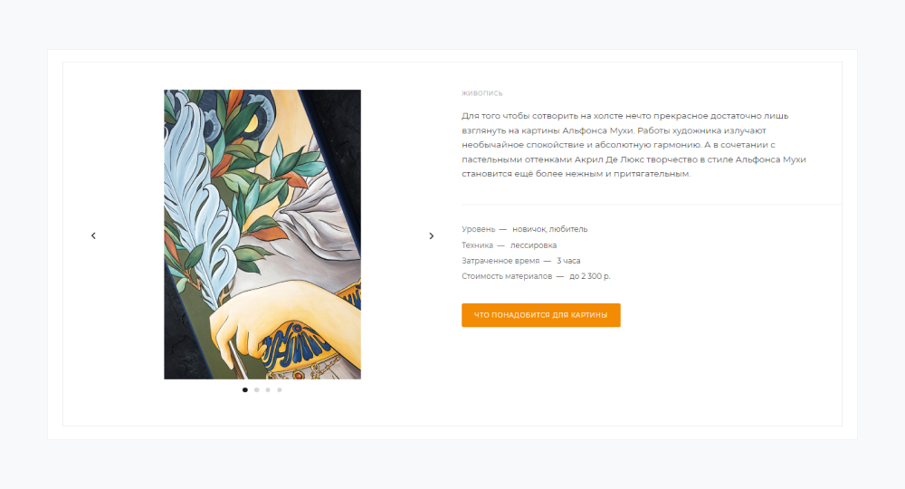 Практическую ценность усиливают кнопки «Что понадобится для картины», которые ведут к соответствующим товарам в каталоге.