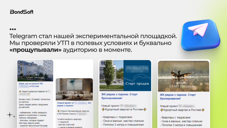 Telegram стал для нас своего рода лабораторией. Мы использовали его не ради продаж, а ради проверки гипотез — короткие тексты, написанные «на эмоции», без квадратных метров и акций.