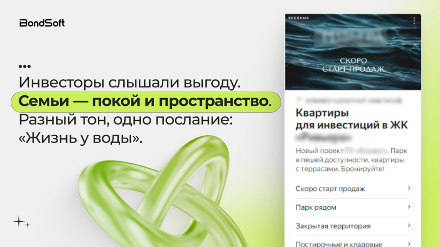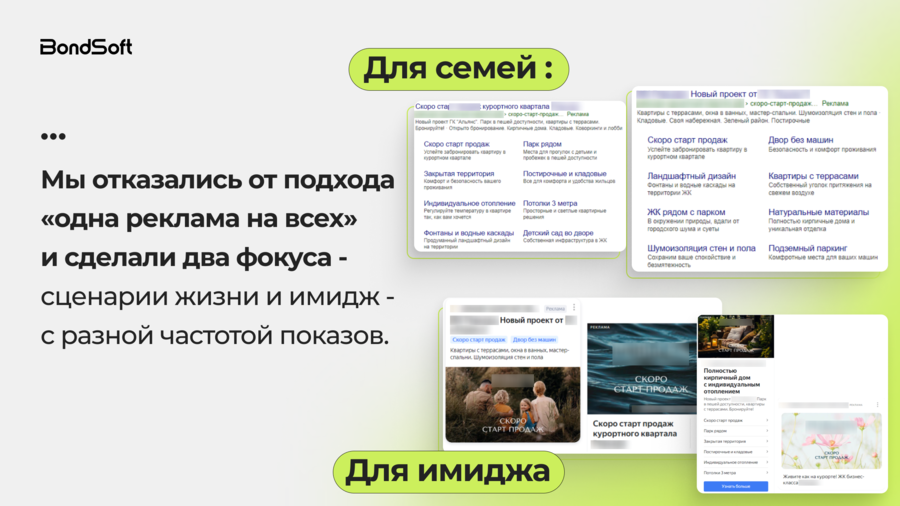 Инсайт: в семейных кампаниях фразы с «домом» и «тишиной» сработали лучше, чем рациональные «комфорт» и «инфраструктура». Постоянное A/B-тестирование позволило оставить только сильные креативы: их стало меньше, но эффективность выросла почти вдвое.
