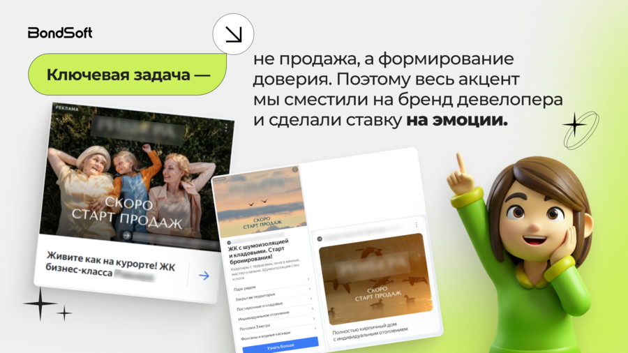 Главный KPI этого этапа — не лиды, а доверие к застройщику. Мы акцентировали внимание на бренде и его статусе генерального подрядчика — чтобы люди понимали: проект реален, за ним стоит сильный девелопер.