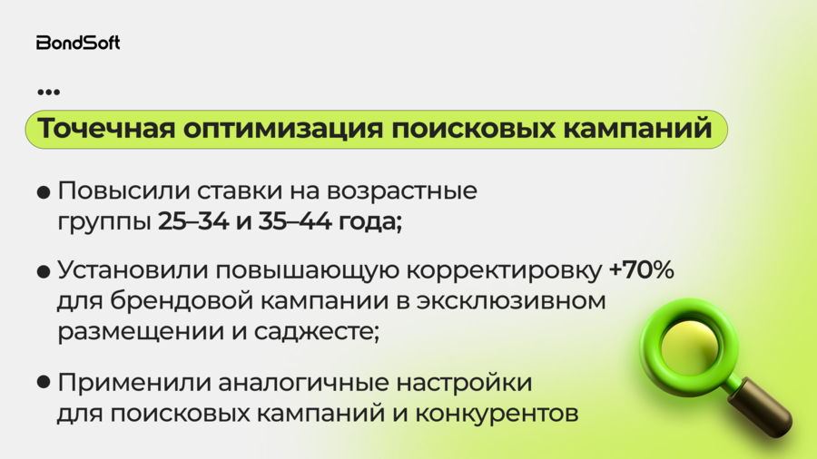 Это позволило перехватывать горячий трафик — пользователей, которые уже находятся в процессе выбора. Стоимость заявки оставалась в целевых рамках, а вовлечённость росла. Так мы заняли пространство не за счёт бюджета, а за счёт точности подачи.