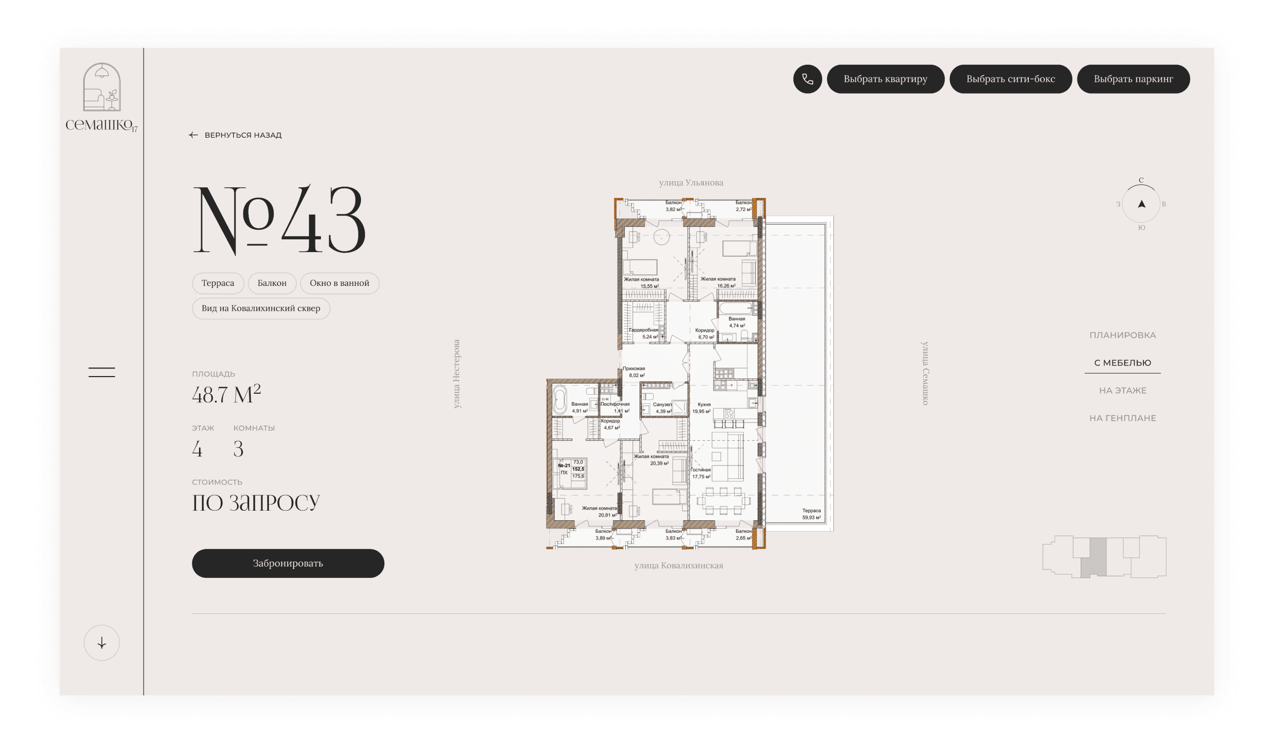 Карточке квартиры мы уделили особое внимание, так как это ключевой момент, где человек переходит от интереса к намерению покупки. Мы ушли от шаблонов и создали нестандартную композицию с акцентом на номер квартиры. Так каждая из 43 квартир воспринимается как индивидуальная — со своим характером и историей.