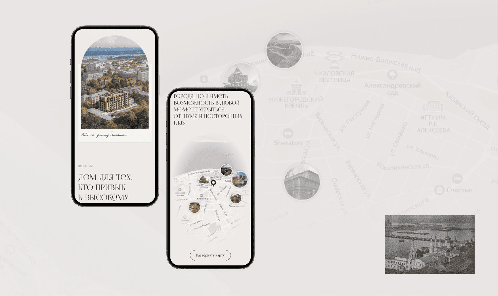 Поэтому основной задачей стало создать не просто красивый сайт, а концептуальный инструмент, который передаёт характер места — ту самую атмосферу Нижнего Новгорода с его узкими улочками, старинными фасадами и ощущением камерности, подчеркивая премиальность локации.