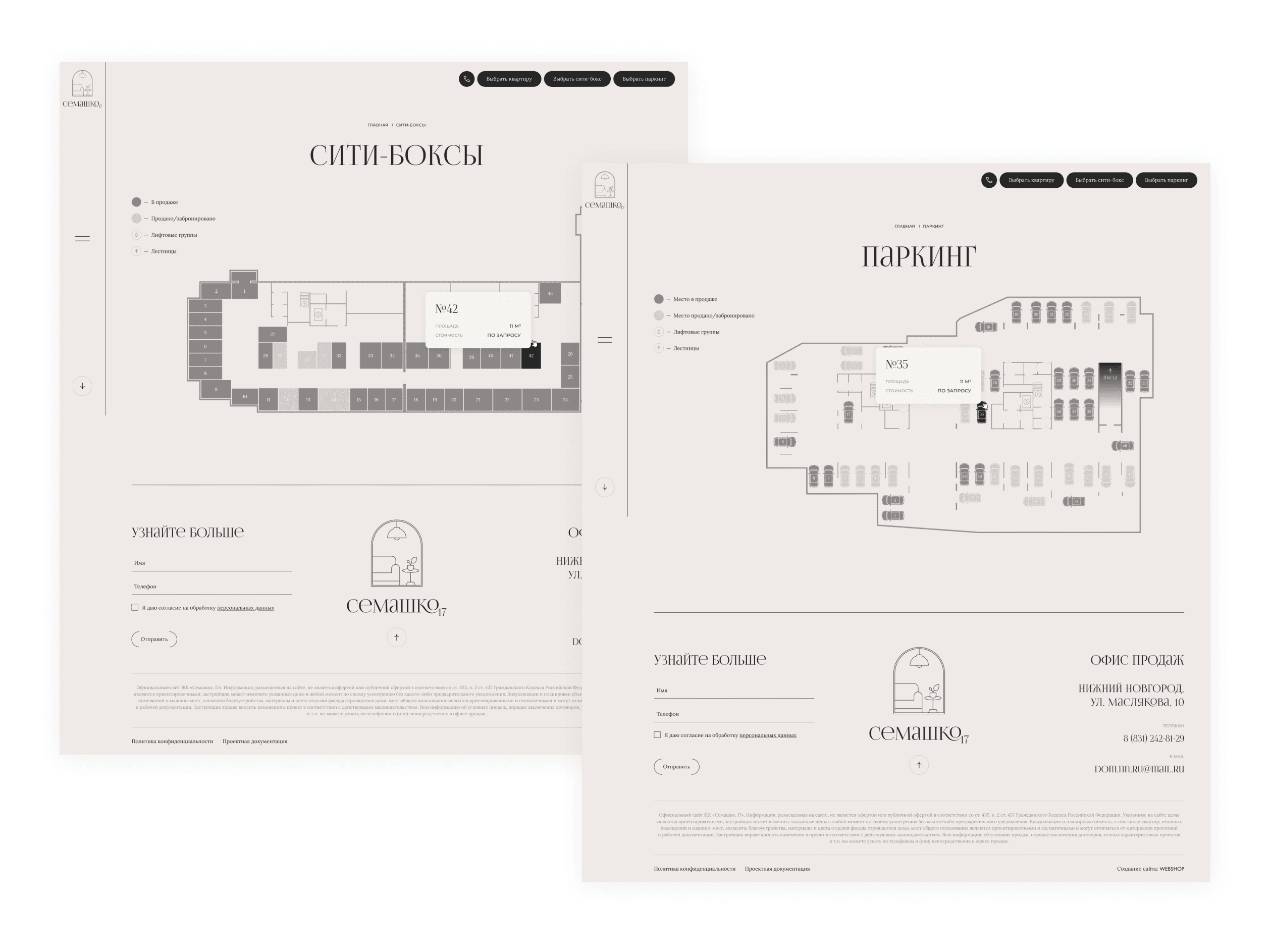В жилом комплексе «Семашко 17» продумана каждая деталь — от фасада до подземного уровня. Мы хотели, чтобы сайт передавал это ощущение системности: здесь всё имеет смысл, всё на своём месте. Помимо квартир, в доме предусмотрены нежилые помещения и парковочные места. Поэтому мы реализовали интерактивные схемы сити-боксов и парковочных мест, где можно наглядно увидеть, какие помещения или места свободны, кликнуть, рассмотреть и сразу выбрать понравившийся лот. Интерфейс реагирует мягко — без резких всплывашек и перегрузки.