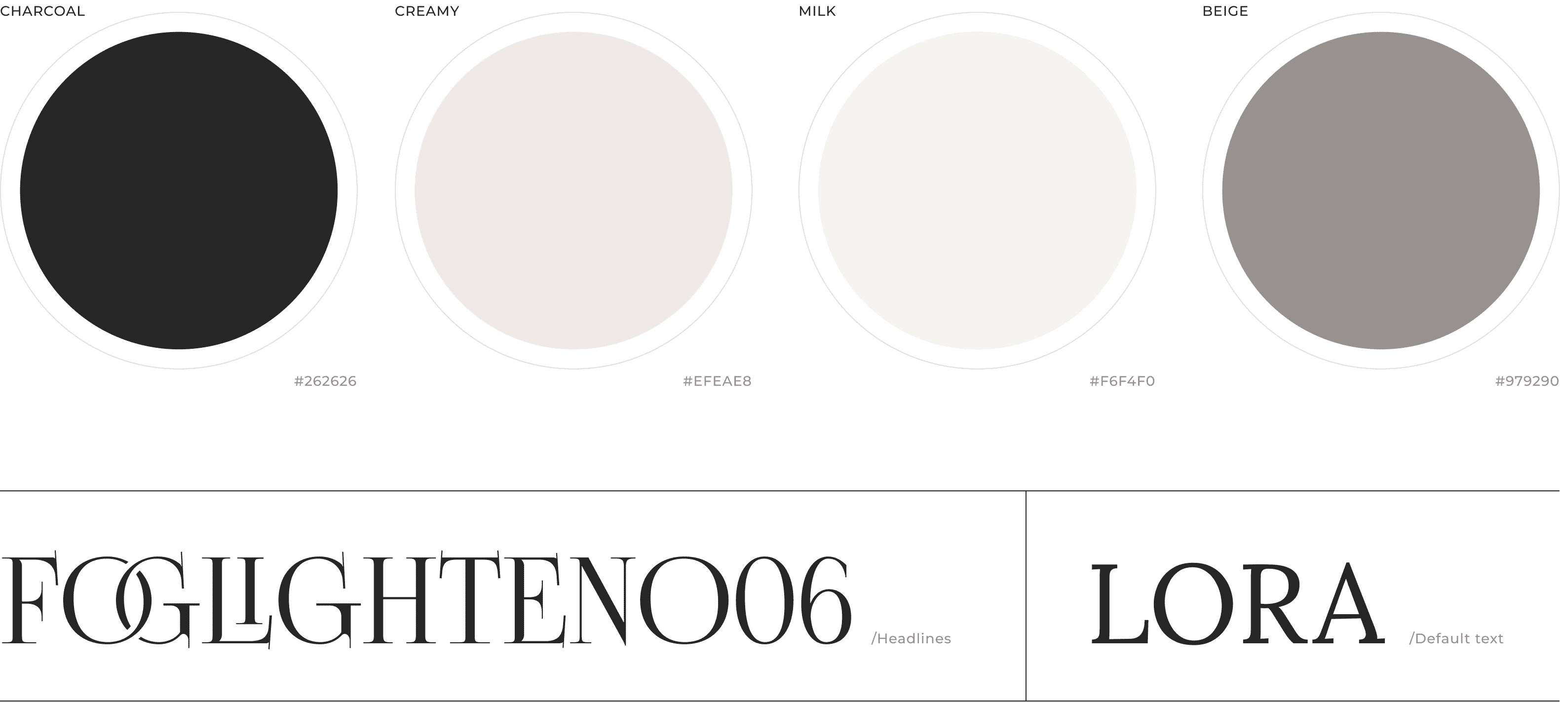 За основу цветовой палитры взяли цвета самого дома, которые дополнительно будут передавать премиальность и историчность. В качестве основного шрифта использовали изящный FoglightenNO6, который также является основой логотипа. Шрифтом для обычного текста взяли более «книжный», но легко читаемый Lora.
