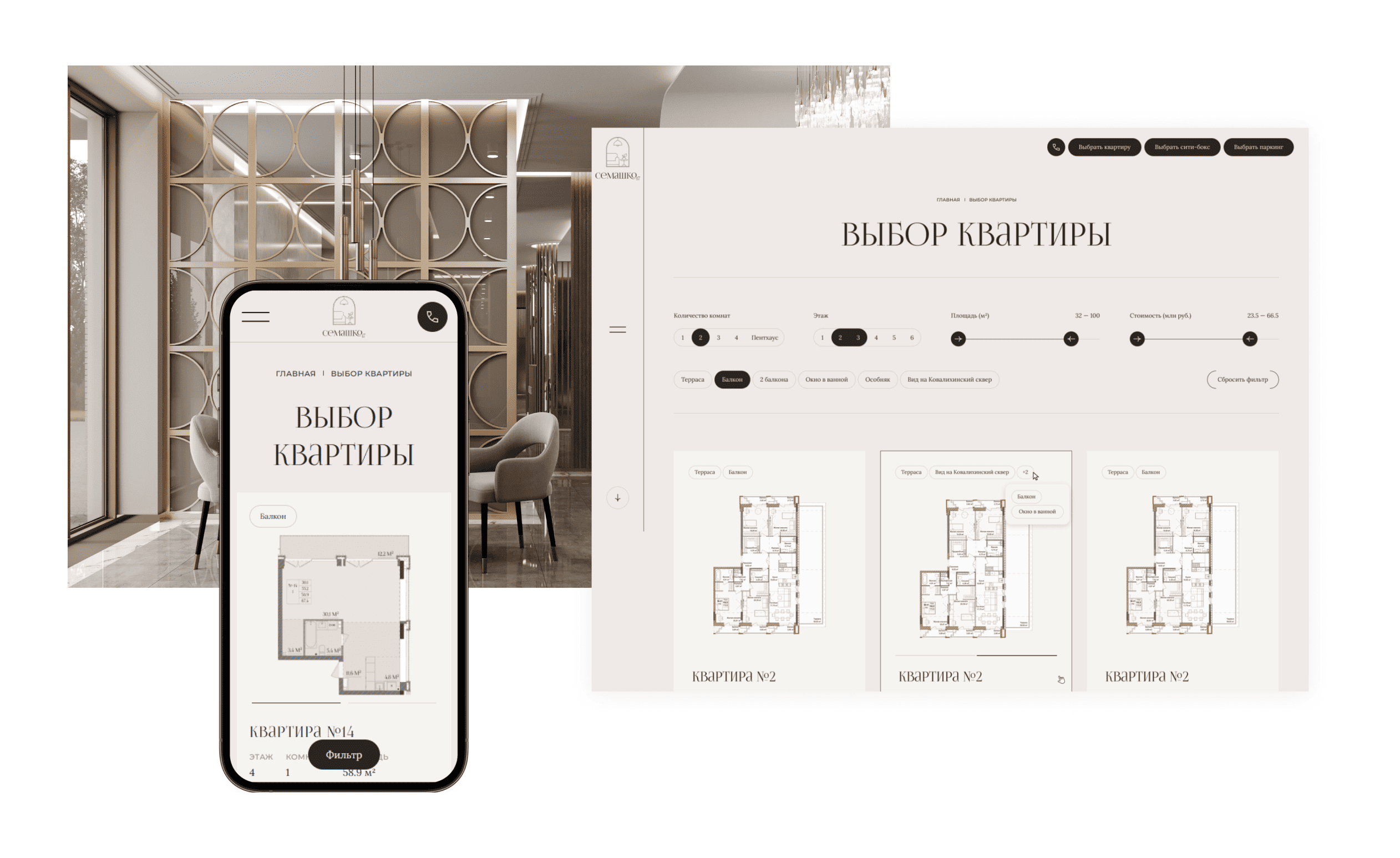 Такая структура позволила превратить карточку квартиры не просто в элемент каталога, а в инструмент для принятия решения. Пользователь получает полную информацию в одном месте, без необходимости переходить между разделами или обращаться к менеджеру. В результате сайт остаётся визуально лаконичным, но при этом решает все задачи, стоящие перед отделом продаж.