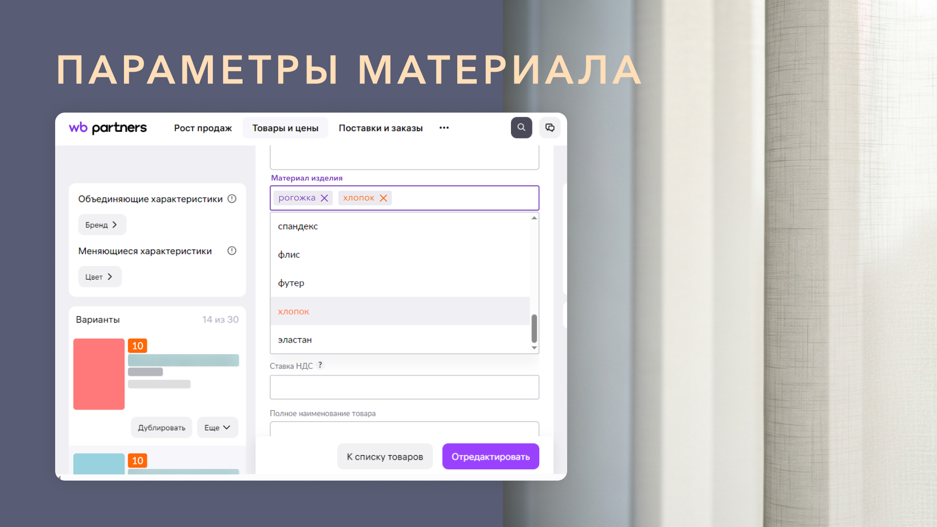 Рекомендовали в параметре «материал» указать «хлопок», т.к. в соответствующих карточках не было предусмотрено параметра «состав», а в параметре «материал» в выпадающем списке значение «хлопок» есть. Нужно пользоваться: