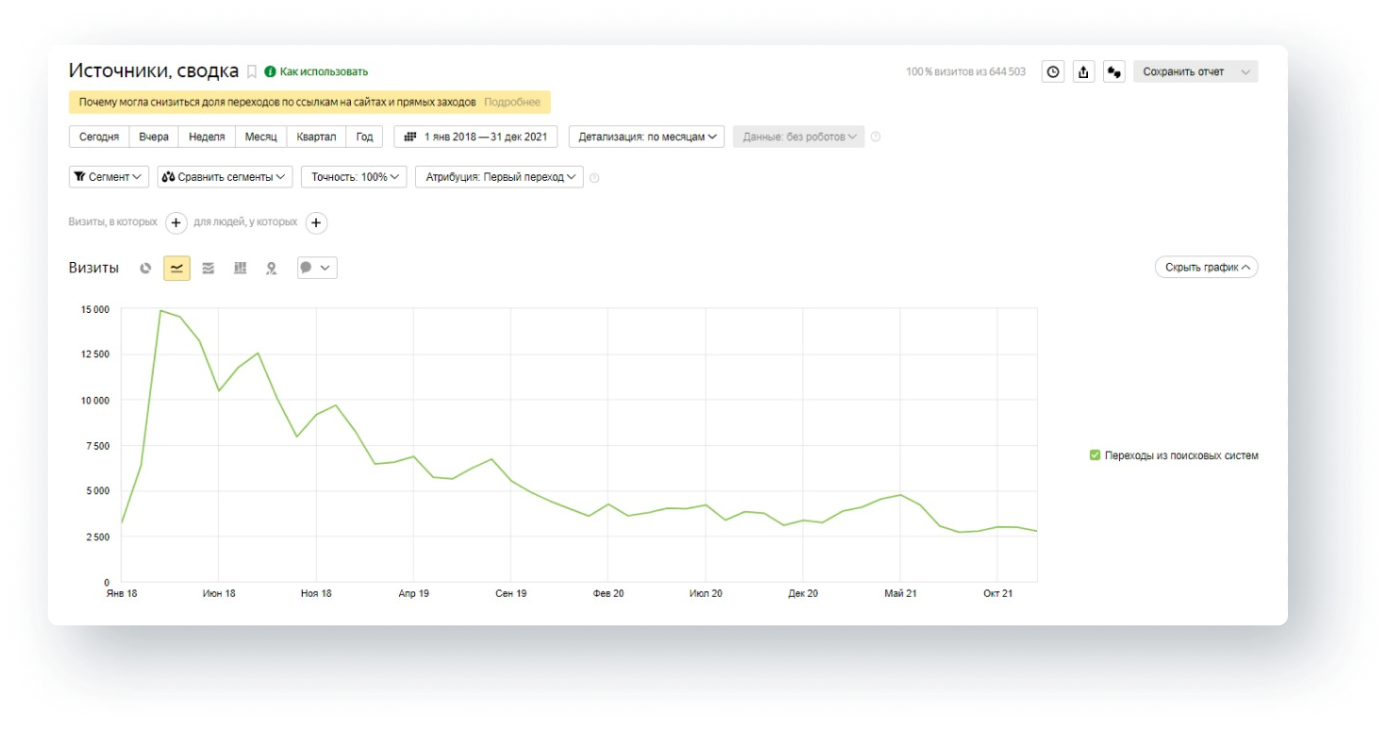 Посещаемость нового сайта из поисковой выдачи постоянно падала. Посетители переходили только по брендовым запросам (это только я, кто знал уже компанию и доверял ей), однако и я не мог разобраться в навигации и уехал.