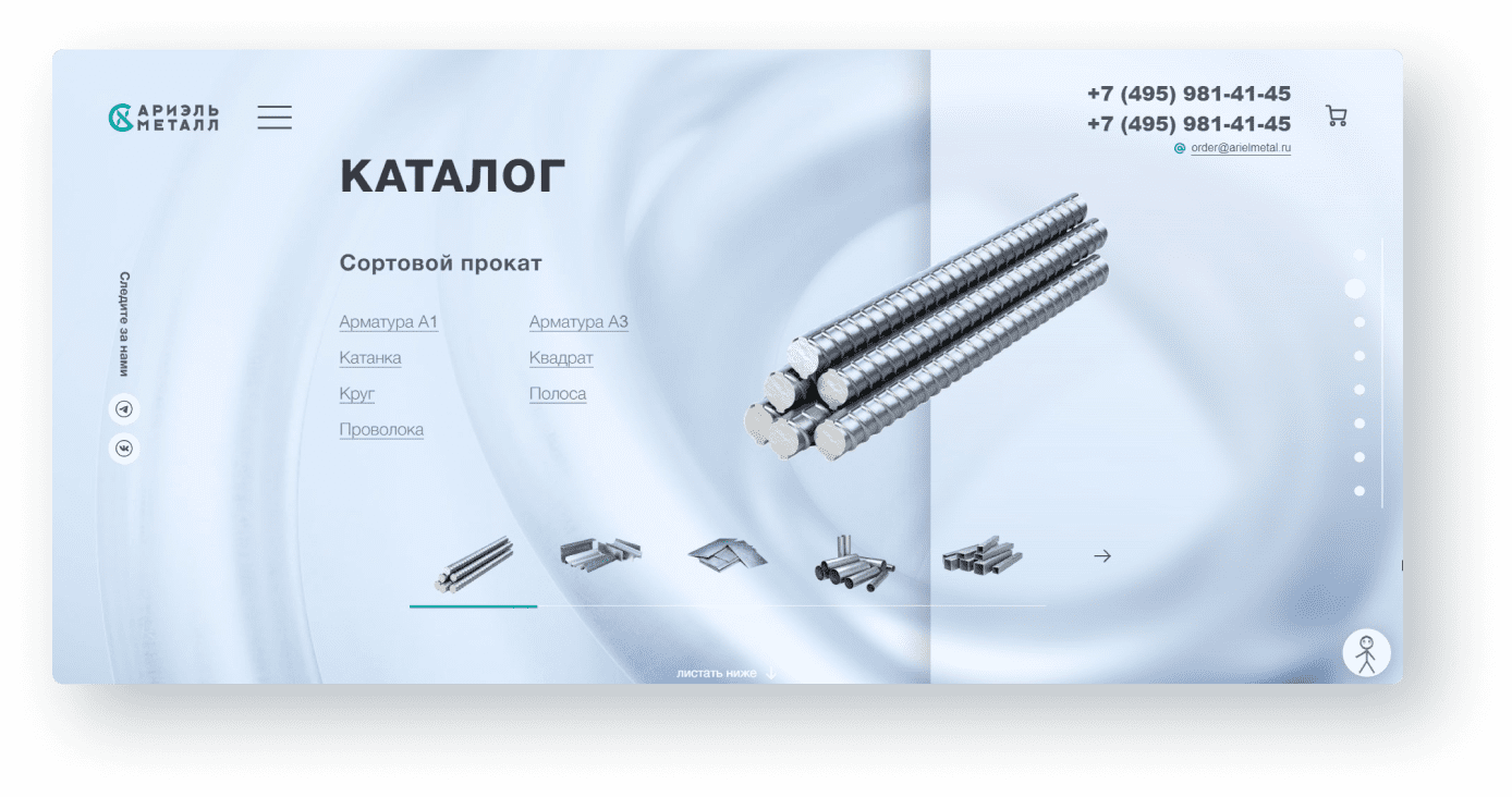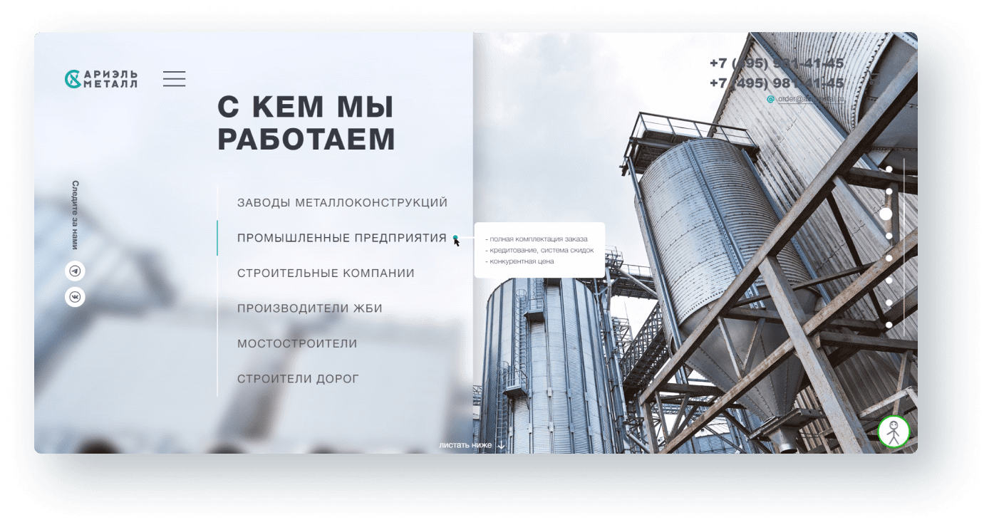 Разместили преимущества и важные цифры компании: 30 лет на рынке, несколько заводов, тысячи тонн металлопроката.