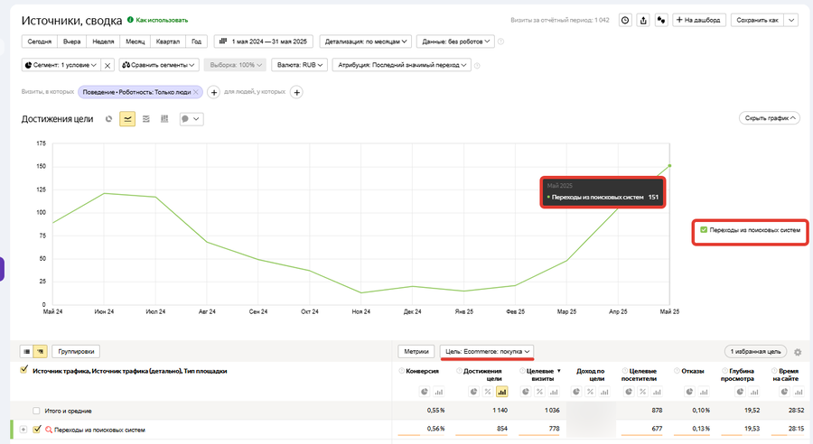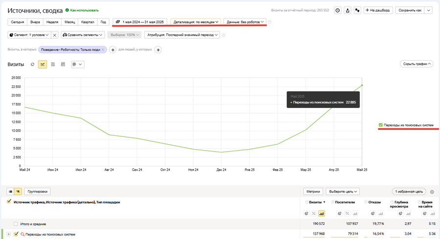 Сравним показатели на пике сезона: май 2024 к маю 2025: Посещаемость выросла на 37%, в мае 2024 года было 16 688 визитов против 22 885 визитов в мае 2025 года