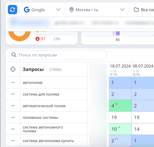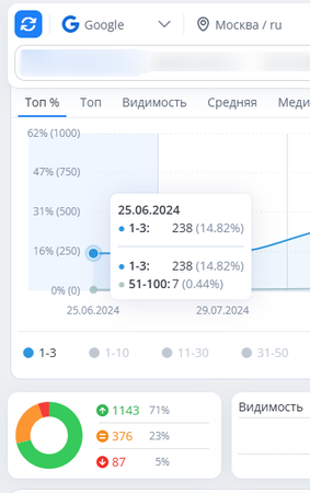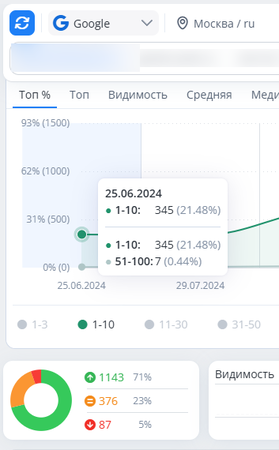 Google: 238 запросов (или 15%) в ТОП-3. 345 запросов (или 21,5%) в ТОП-10