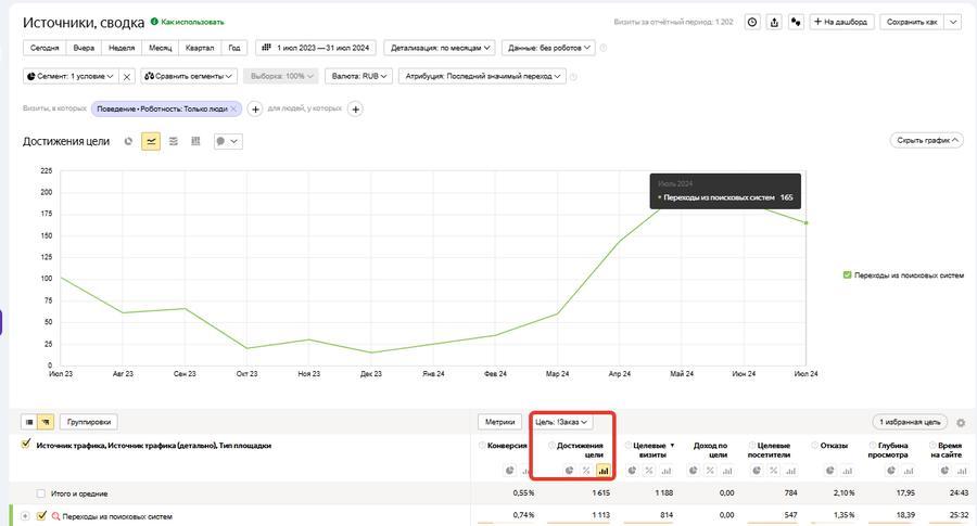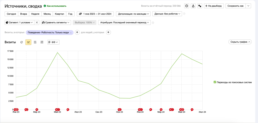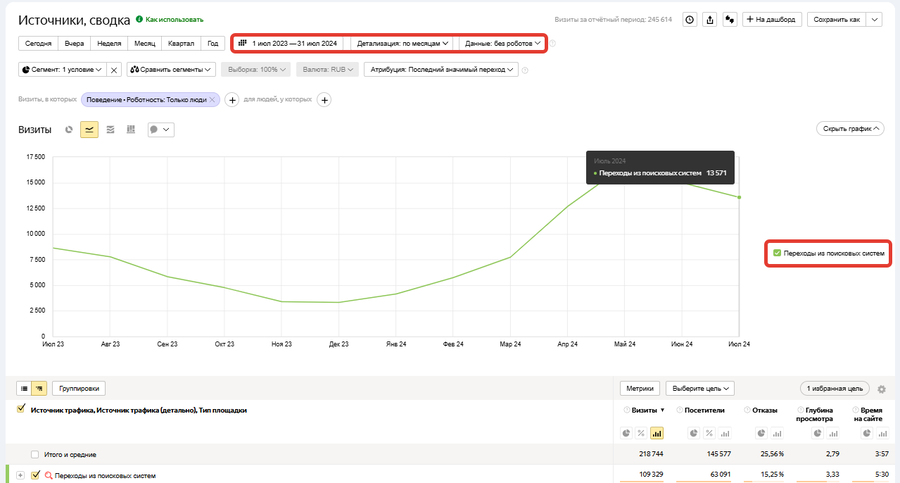 Трафик из поисковых систем по сравнению с тем же периодом прошлого года увеличился на 57%. В июле 2024 года 8636 визитов против 13571 визит в июле 2024 года