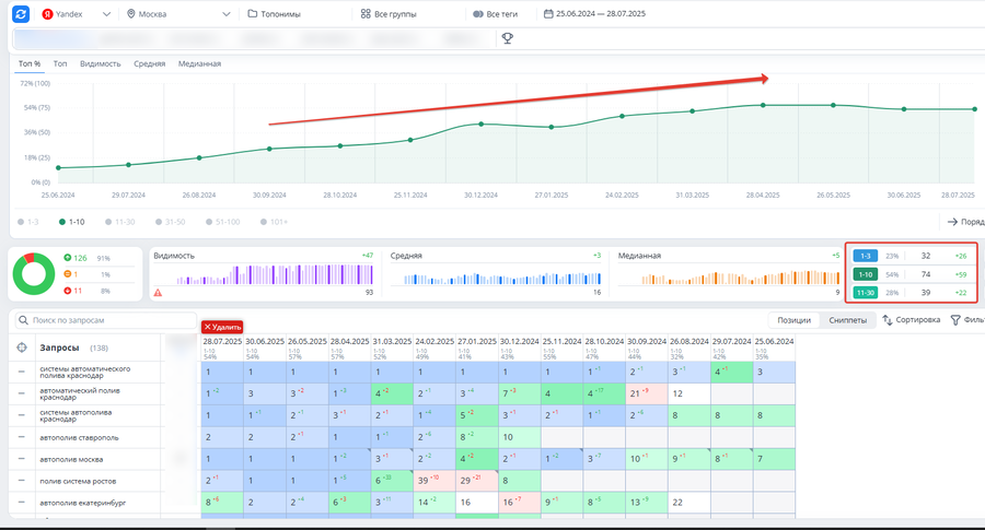 Видимость и проценты в ТОПе Яндекса после тестирования гипотезы: