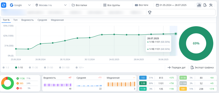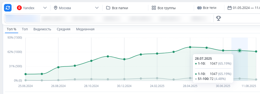 Процент в ТОП-10 Яндекс на 28.07.25: