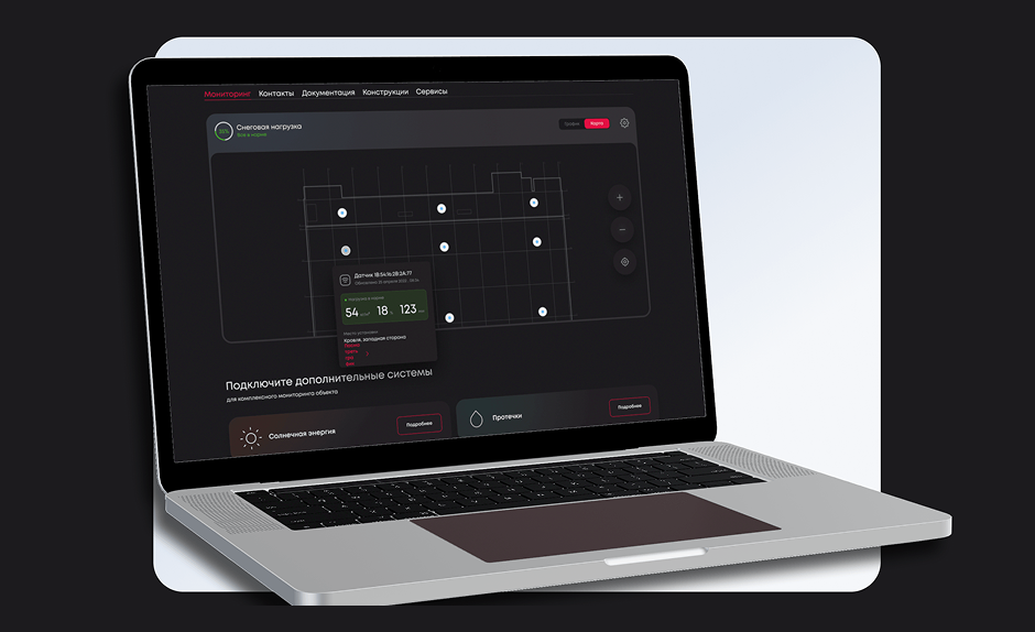ЛК разделен на 5 основных секций. Каждая содержит свой функционал и кликабельные элементы. В основе лежит мониторинг конкретной системы. Например, снеговой нагрузки. Мониторинг интерактивный. Вы можете изменить вид отображения данных с карты на график, чтобы подробнее ознакомиться с нагрузкой на выбранный промежуток времени.