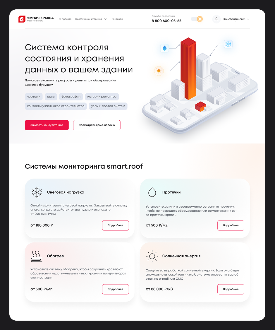 Здесь пользователя знакомят с основным функционалом сайта и рассказывают о всех преимуществах «Умной крыши». Это точка входа и некий первый контакт пользователя с нашим сервисом.