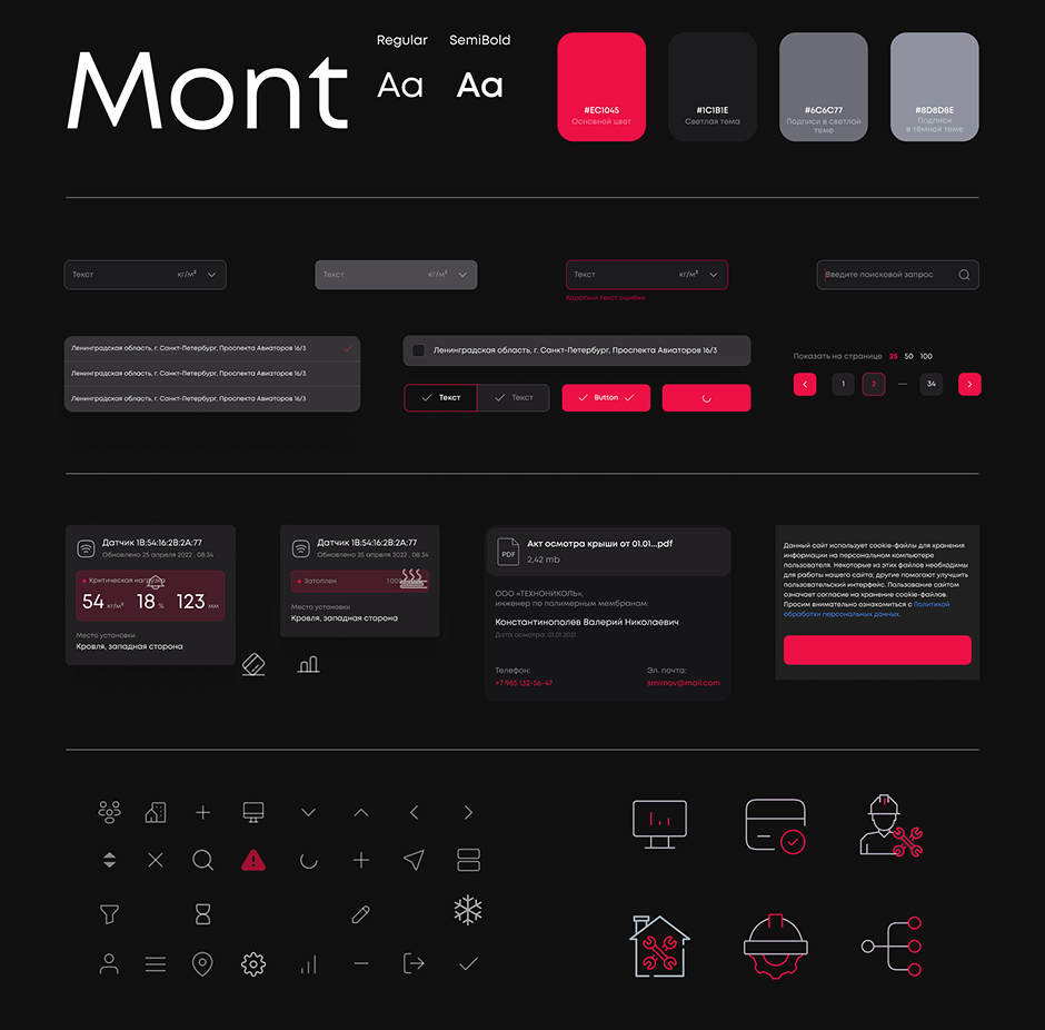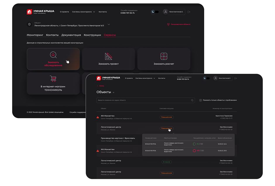 — Разработать интерфейсы административной панели для специалистов со стороны ТЕХНОНИКОЛЬ, чтобы они могли видеть все объекты и создавать новые, управлять доступами пользователей, также иметь возможность мониторинга статистики, отслеживать активность датчиков.