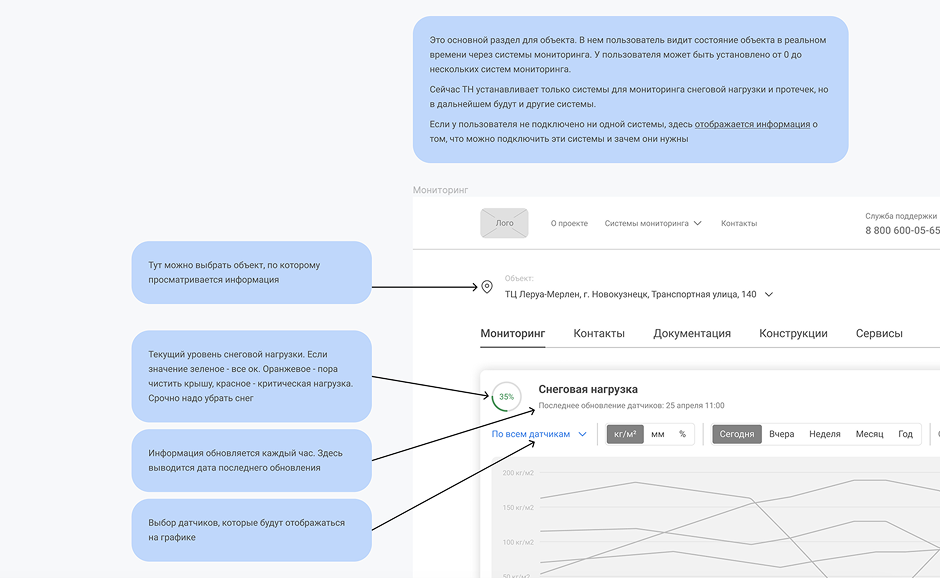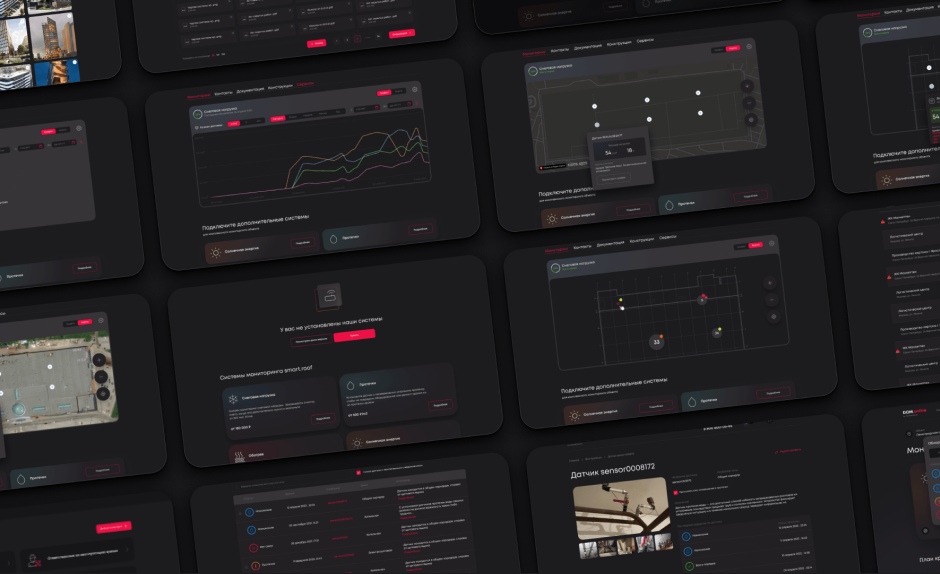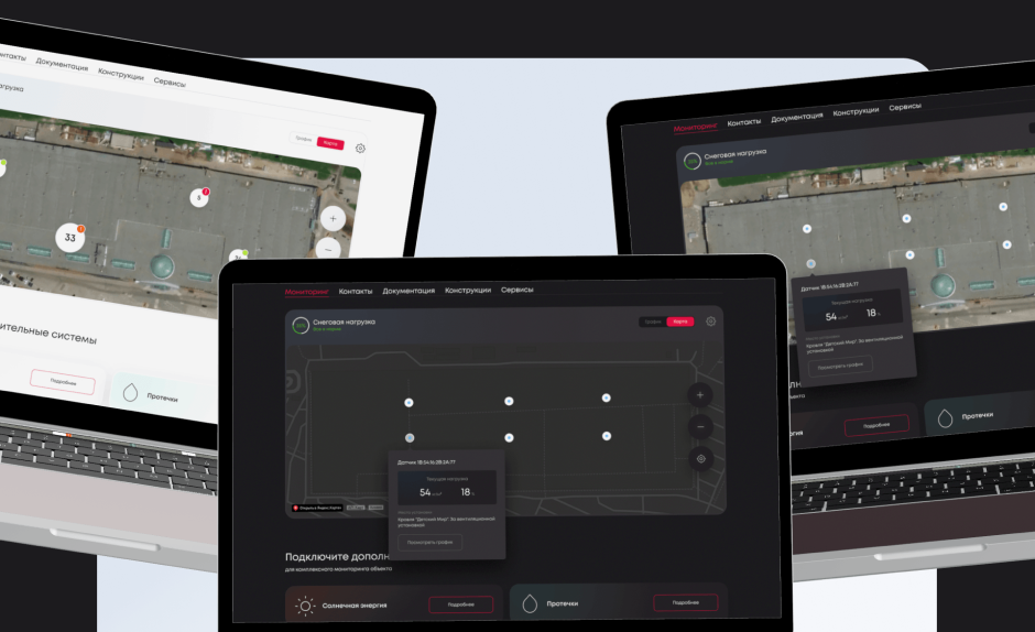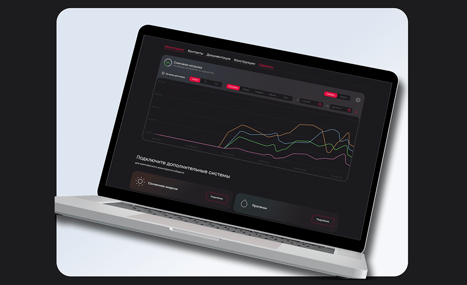 Умная крыша — система отслеживания поверхности крыш. Работает через датчики, которые в режиме реального времени мониторят ситуацию сверху. Датчики отслеживают все лишние объекты на кровле и своевременно предупреждают пользователей о выпавшем снеге / возникновении протечки. Для этого нужно было разработать детальную страницу в личном кабинете с графиками, которые затрагивают все процессы мониторинга.