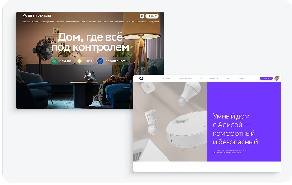 В начале работы провели анализ конкурентов. Среди конкурентов были выбраны крупнейшие компании, разрабатывающие свои умные дома. Основное, что нас интересовало — как отображаются подключенные устройства, как работают устройства с определенной зоной действия (например, робот-пылесос), как контролируется освещение в разных комнатах и так далее. Нам было важно учесть это, чтобы применить лучшие решения в реализации мониторинга показателей датчиков.