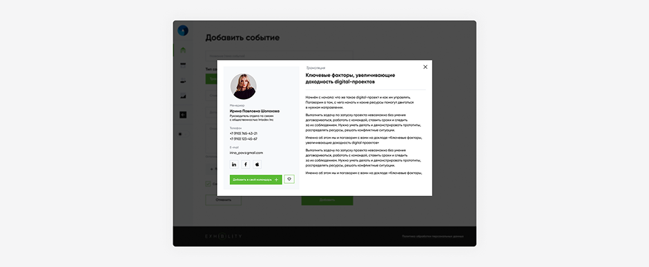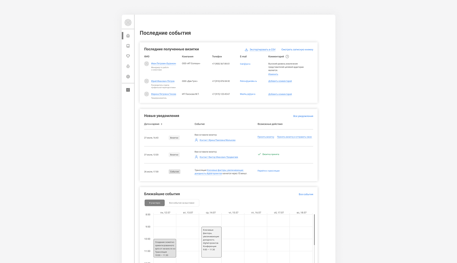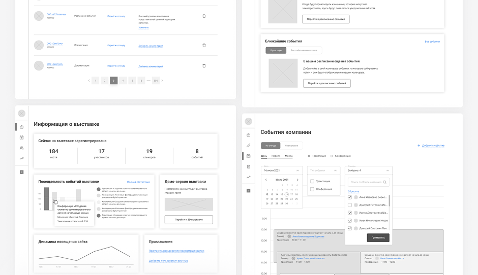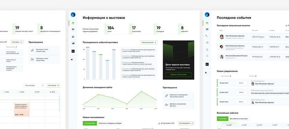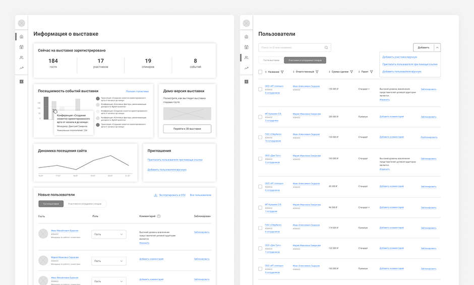 Статистику по выставке разместили в первых блоках личного кабинета, ?чтобы пользователь мог быстро отслеживать изменения. Помимо этого, спроектировали удобный список гостей и участников, который помогает администрировать выставку