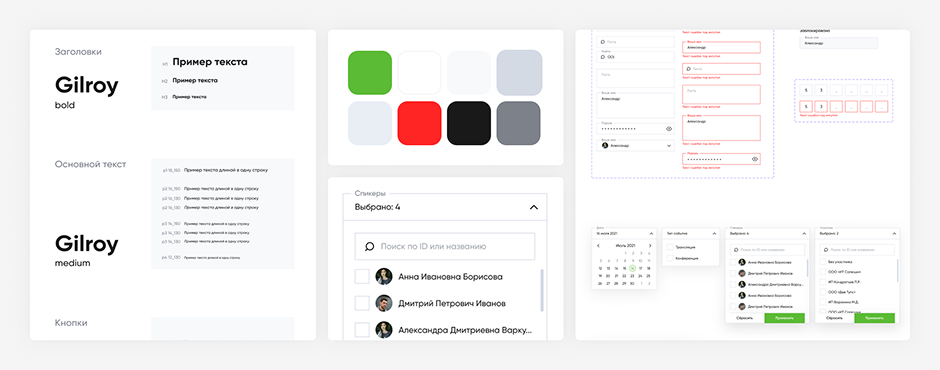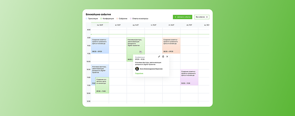 Мы расставили цветовые акценты на важных для пользователя параметрах (зависит от роли на мероприятии). Зеленым цветом помечены важные параметры, графики, табы и кнопки. События в календаре делятся на типы, каждый тип события имеет собственное цветовое обозначение.