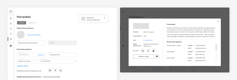Пользователь может заполнить данные о себе в настройках профиля. Эти данные будут отображаться в его карточке и визитках.