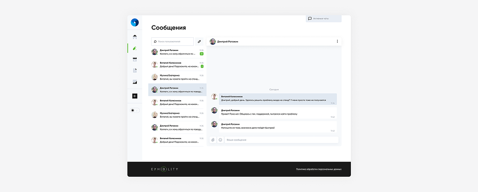 В верхнем правом углу разместили кнопку «Активные чаты» и добавили поиск пользователей. Благодаря этому пользователи сможет быстро перемещаться по чатам