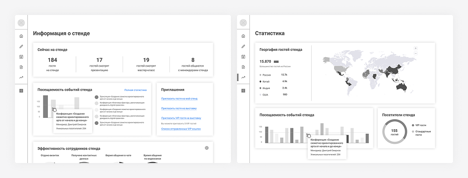 В дашборде располагается полезная информация о стенде. Благодаря блоку «Эффективность сотрудников стенда», компания может отслеживать и повышать свои показатели. При этом, статистика стенда помогает компаниям узнавать больше информации о своих гостях